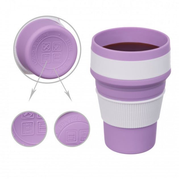 Портативная складная чашка с крышкой выполнена из пищевого термостойкого силикона. Оригинальным решением от сдавливания и для удобного держания силиконовой чашки, является жесткий пластиковый ободок, который позволит не обжечь пальцы, если напиток слишком горячий и предотвращает его проливание. Крышка плотно закрывает чашку, обеспечивая герметичность и удерживая длительное время температуру напитка. Силиконовая чашка удобно складывается, при этом высота в сложенном виде составляет всего 6 см, ее можно даже положить в карман.