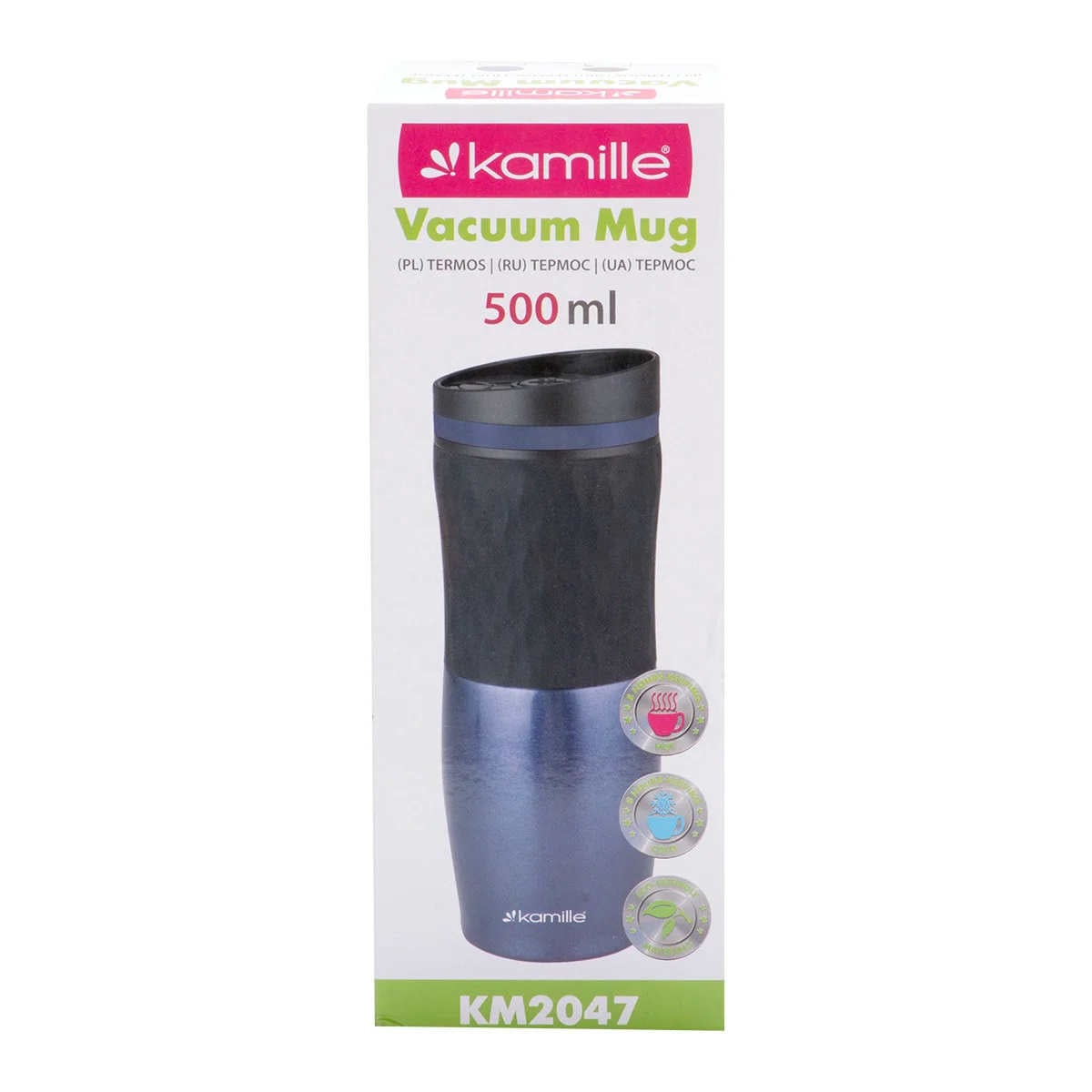 Термокружка Kamille из нержавеющей стали с TPR вставкой обладает высоким качеством, надежностью, компактными размерами и эстетичным дизайном. Горячее остается горячим, а холодное — холодным. Такая практичная термокружка с TPR вставкой станет незаменимой в машине, на отдыхе или в путешествии. Чашка-термос 500 мл Kamille из нержавеющей стали с TPR вставкой серый КМ-2047 Характеристика: - Тип термоса: питьевой. - Материал корпуса: нержавеющая сталь, мягкая TPR-накладка и ПП. - Материал колбы: нержавеющая сталь. - Материал крышки: силикон и пищевой пластик - Объем: 500 мл. Высота: 22 см. - Съемный клапан: нет (встроен в крышку). - Ручка: нет. - Поверхность: глянцевая с пудровым напылением. - Время сохранения температуры: 6-8 часов. - Упаковка: картонная коробка 8,6 х 8,6 х 23 см. Особенности: Эксклюзивный дизайн, глянцевая поверхность, высокопрочная конструкция, 100% герметичен