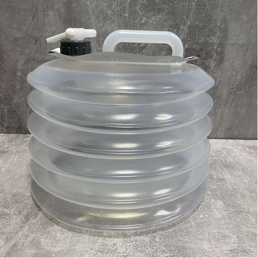 Сладная канистра для воды отлично подойдет для туристических походов, пикников. В сложенном состоянии занимает совсем мало места, что очень комфортно в производных условиях. Практическая ручка, удобный "носик" для литья, такую ​​канистру удобно транспортировать. Сделана из надежного, крепкого материала.