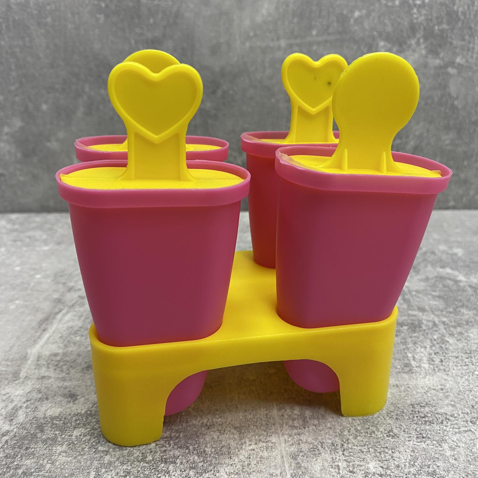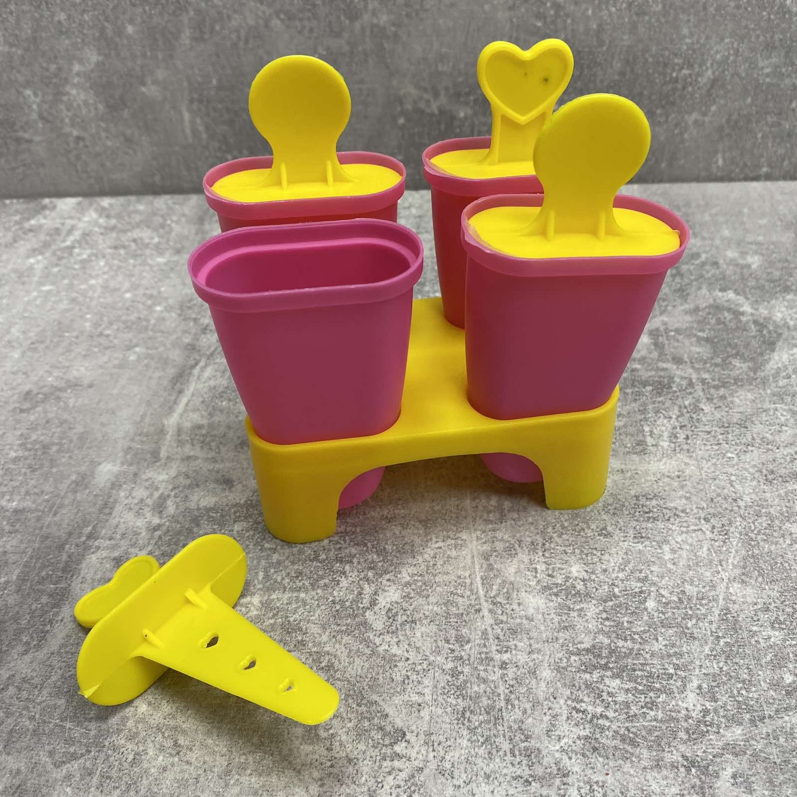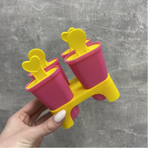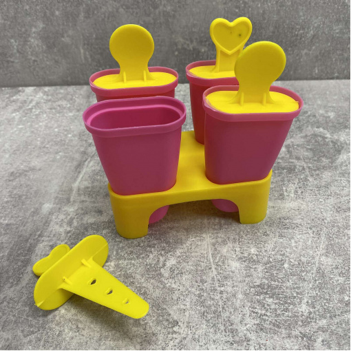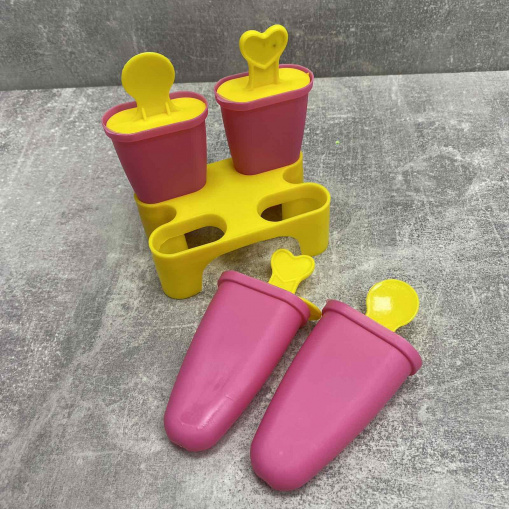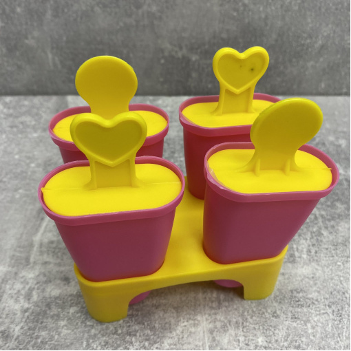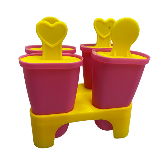 Форма для мороженого с подставкой 4 шт розовый с желтым Stenson R21144 Форма для мороженого отличается веселым дизайном и практичностью. Набор состоит из основания и четырех извлекаемых формочек для фруктового льда или мороженого. Каждая формочка имеет крышку с декоративной ручкой-палочкой. Такие формы - отличное решение для замораживания воды, сока, соусов, а так же создания конфет из шоколада. Пищевой материал без запаха, не выделяет химических веществ даже при очень высоких и низких температурах. Характеристика: Вид: Форма Назначение: Для мороженого Материал: Пищевой пластик Высота с подставкой: 12,5 Размер формочки: 11*4,5*2 см Цвет: Розовый с желтым