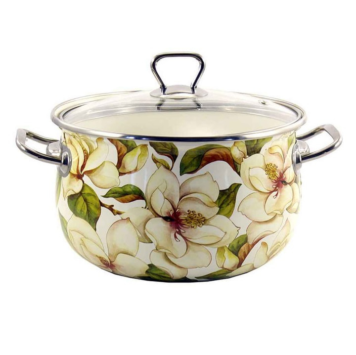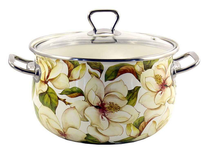 Кастрюля эмалированная Магнолия 2,1 л 16 см Interos 17150-2,1 Эмалированные кастрюли Interos с двухслойным стеклоэмали покрытием представлены в 6 различных объемах. Дизайн покрытия, разработанного итальянскими художниками, и высокое качество эмалированного покрытия не оставит равнодушным ни одну хозяйку. Характеристики: Вид: Кастрюля Объем: 2,1 л Диаметр: 16 см Материал: Углеродистая сталь + стеклоэмаль Материал крышки: Стекло Декорирование: С цветочным принтом Можно мыть в посудомоечной машине Подходит для всех видов плит
