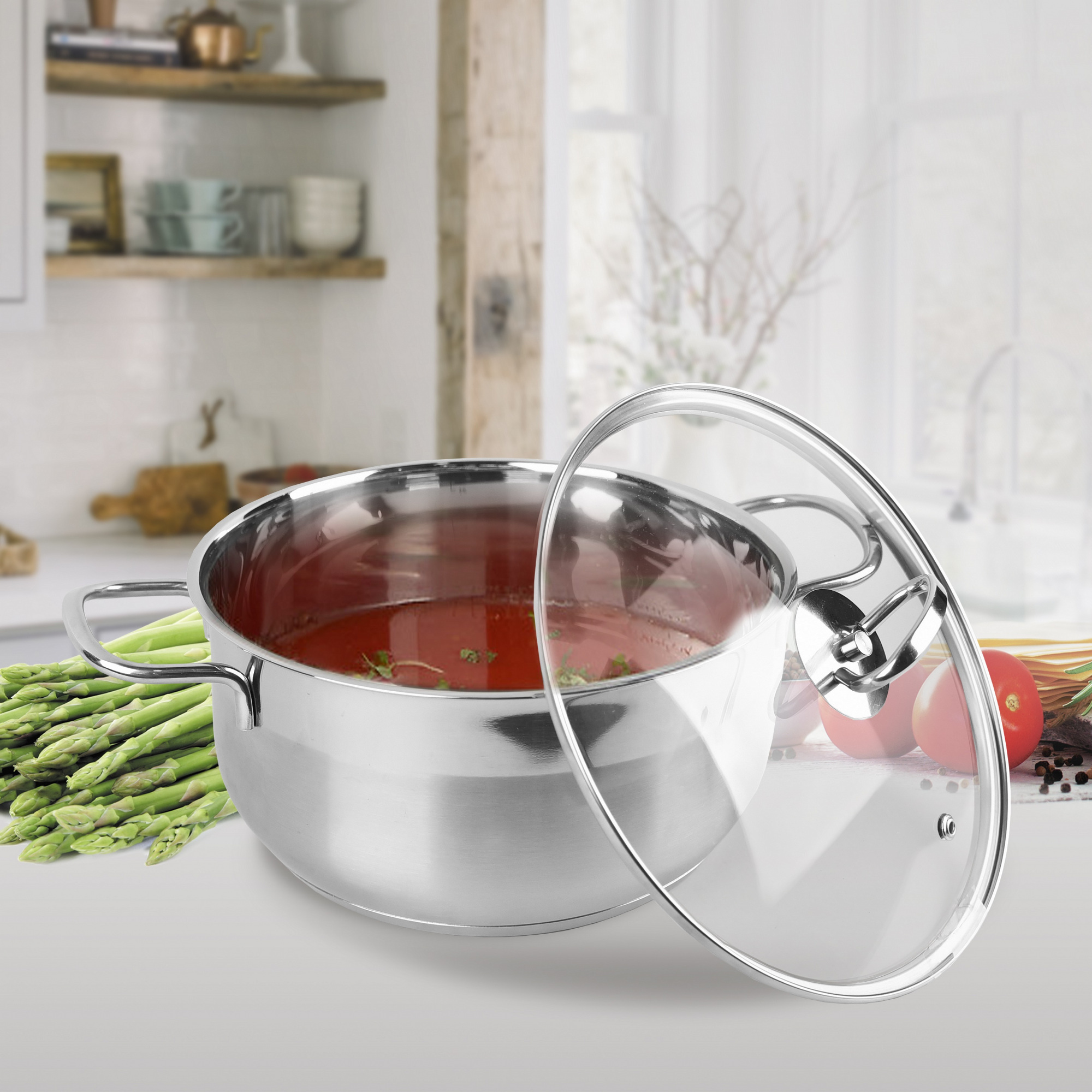 Кастрюля Maestro изготовлена ​​из нержавеющей стали, имеет многослойное капсульное дно, позволяющее использовать любые источники тепла, включая индукцию. Большие удобные металлические ручки кастрюли без накладок позволяют готовить как на открытом огне, так и в духовке. Стеклянная крышка с отверстием для пара.