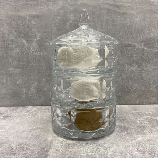 Изысканный дизайн этой конфетницы делает ее роскошным украшением любого праздничного стола. Даже если вы поставите ее на обеденный стол, она превратит обычный стол в праздничный своим прекрасным видом. Удобно использовать для хранения различных вкусностей, потому что конфетница складывается и имеет крышку ваши продукты будут дольше храниться. Можно использовать как 3-х ярусную конфетницу, а также отдельно как салатники.