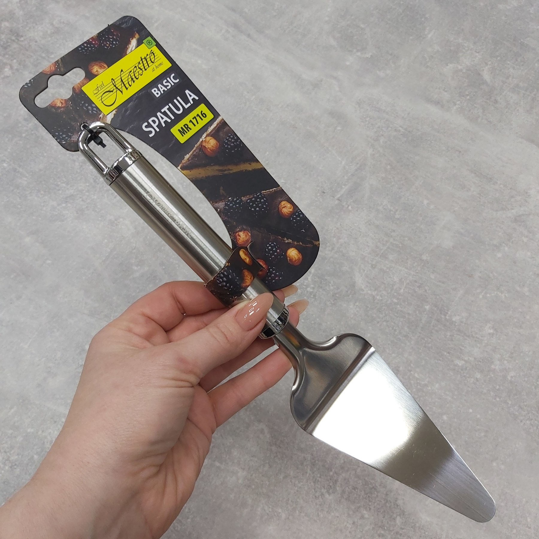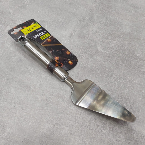 Компанія Maestro LLC займається понад 20 років виробництвом товарів для кухні, побутової техніки та посуду. Якість товару, стабільність цін, постійна наявність товару в асортименті, розширення модельного ряду – головні складові успіху торгової марки Maestro. Лопатка для тортів, пирогів і тістечок з нержавіючої сталі Maestro MR 1716. Лопатка трикутної форми з вигином дозволяє зручно підбирати з блюда шматочки відрізаного пирога або торта і перекладати їх на індивідуальні тарілки.