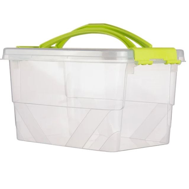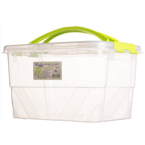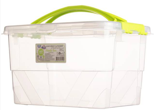 Контейнер пищевой Handy Box на замках прозрачный зеленые ручки 14л MAP-72105 Транспортировочный размер: 37,4х27,1х21,7см. Размер без крышки: 37,4х26,7х21,4см. Объем: 14л. Материал: полипропилен. Для изготовления ручек использован пищевой краситель. Цвет ручек: салатовый. Может использоваться для пищевых продуктов, а также в микроволновой печи. Можно мыть в посудомойной машине. При использовании в микроволновой печи обязательно снять крышку. Рассчитан на температуру от -25 °C до +95 °C. Контейнер плотно закрывается крышкой на 4 замка-защелки по бокам. Сверху на крышке расположены две ручки для переноски. Конструкция позволяет опускать ручки вниз, что позволяет экономить пространство при хранении. Срок годности неограничен.