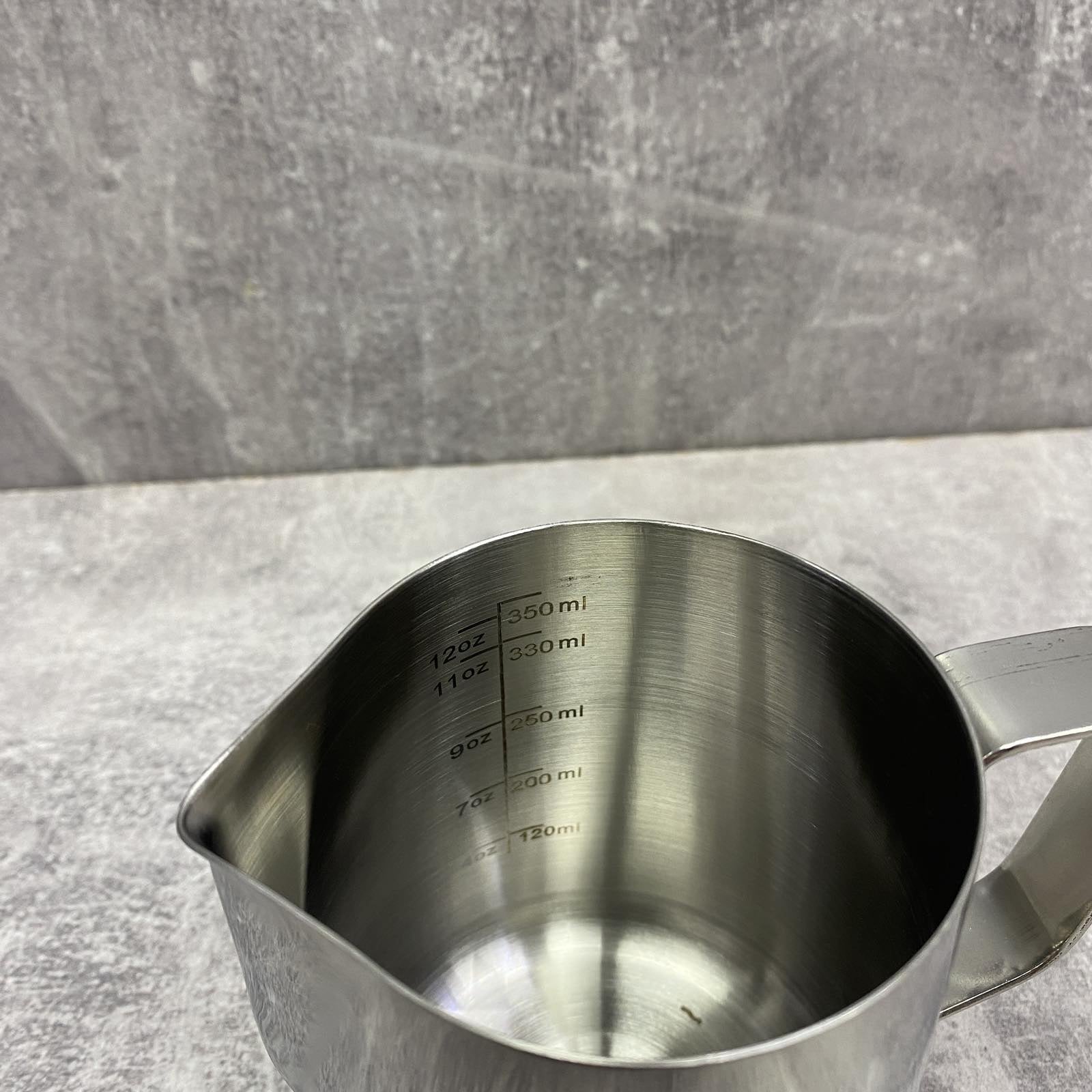 Молочник из нержавеющей стали 350мл с носиком и ручкой. Нанесена удобная шкала для удобства приготовления. Можно мыть в посудомоечной машине. Характеристика: Вид: Молочник Материал: Нержавеющая сталь Цвет: Стальной Высота: 9 см Диаметр: 7,7 см