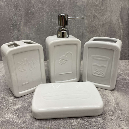 Набор для ванной – это функциональный набор аксессуаров для ванной комнаты с современным, стильным дизайном. Набор состоит из 4 предметов: дозатора для жидкого мыла, мыльницы для жесткого мыла, подставки для зубных щеток и стакана. Изделия гармонично впишутся в интерьер вашей ванной комнаты и украсят ее.