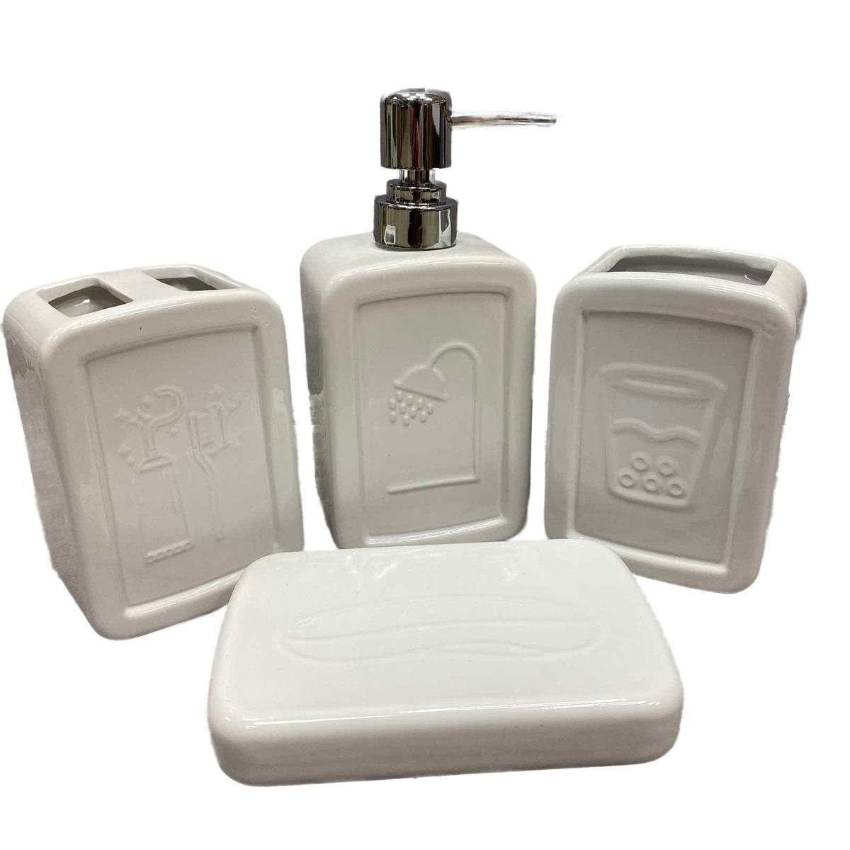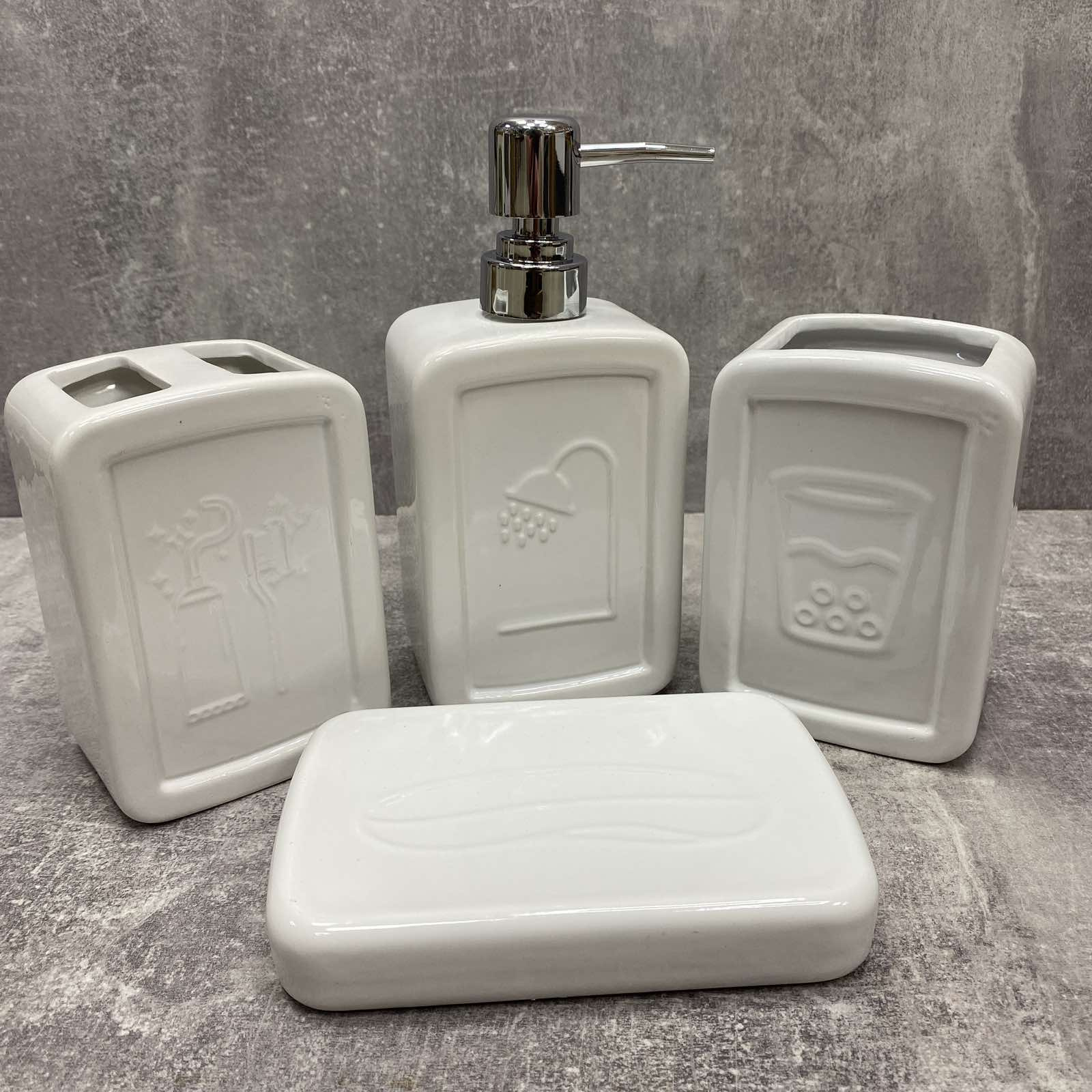 Комплектация: Дозатор для жидкого мыла, подставка для зубных щеток, стакан, мыльница