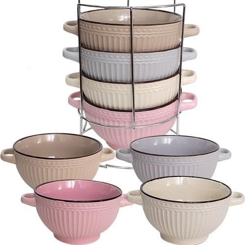 Материал: Керамика; Материал подставки: Хромированная сталь Объем: 680 мл .; Предметов: 4 штук; Можно мыть в посудомоечной машине Цвет: Разноцветные Производитель: SNT Подарочная упаковка.