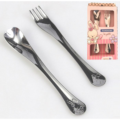Изготовлены из нержавеющей стали 18/10 с тщательно обработанными краями и идеальной зеркальной полировкой. На каждом предмете набора рисунок-гравировка: зайчик, цветочек. Столовые приборы, предназначенные для малышей они очень удобны, их форма учитывает особенности и размер детских ручек. Столовые приборы легко моется вручную и в посудомоечной машине.  Упаковано в яркую подарочную коробку.
