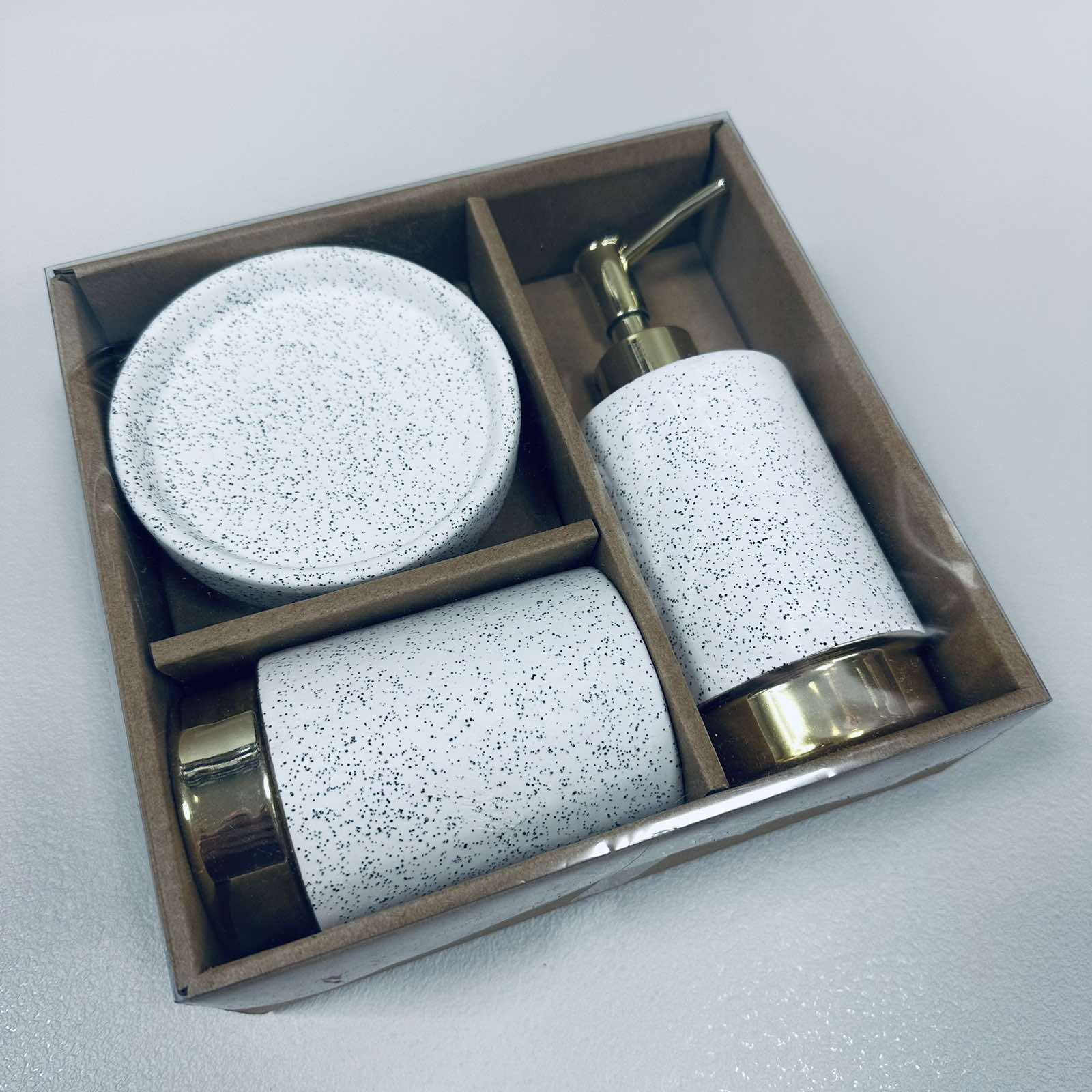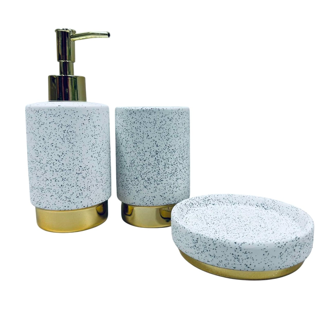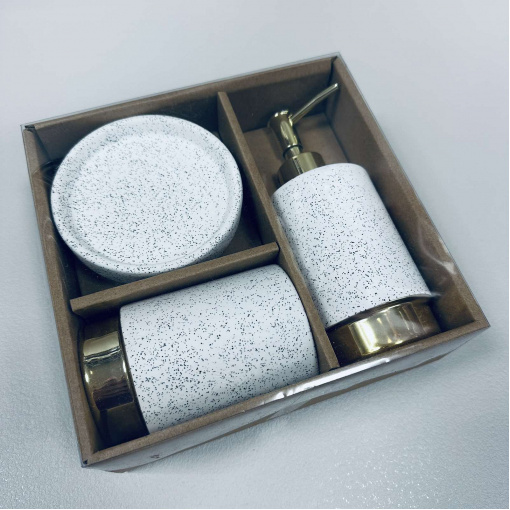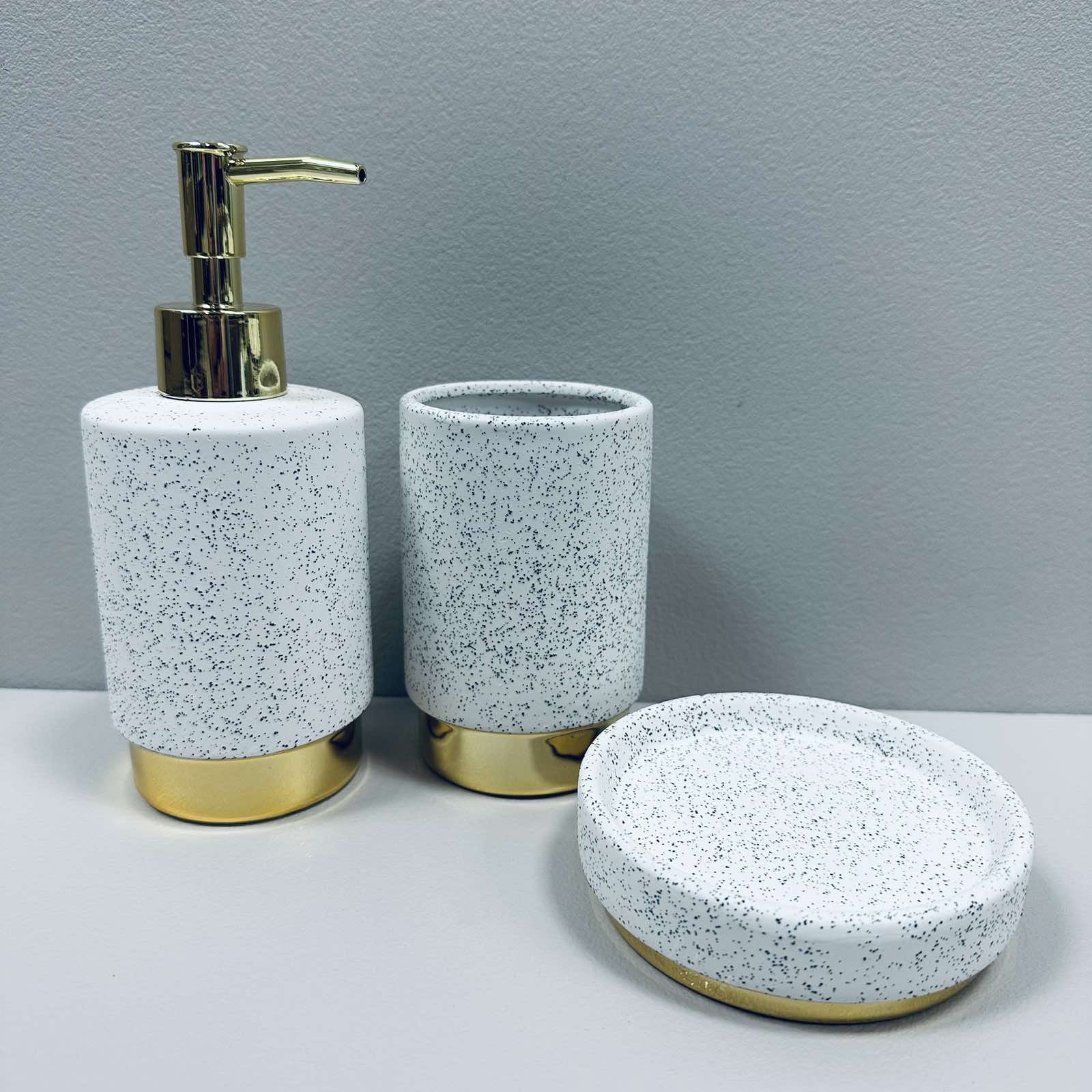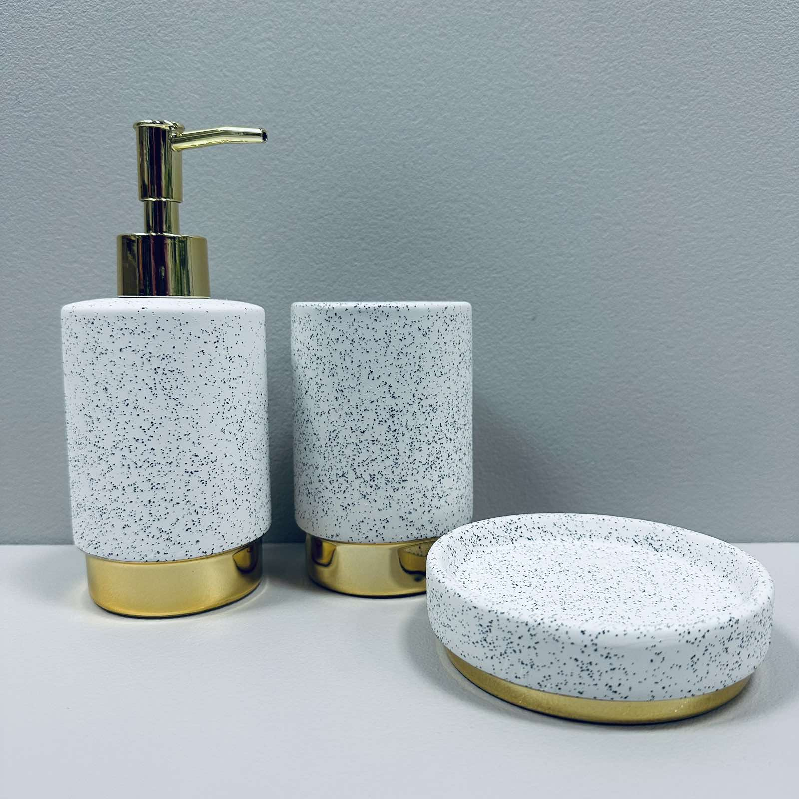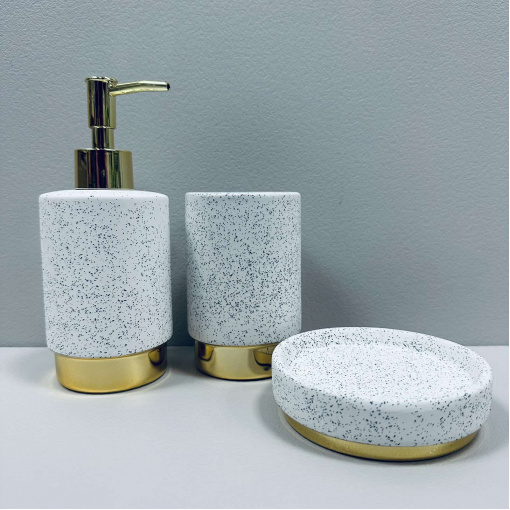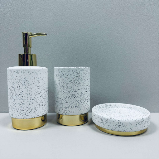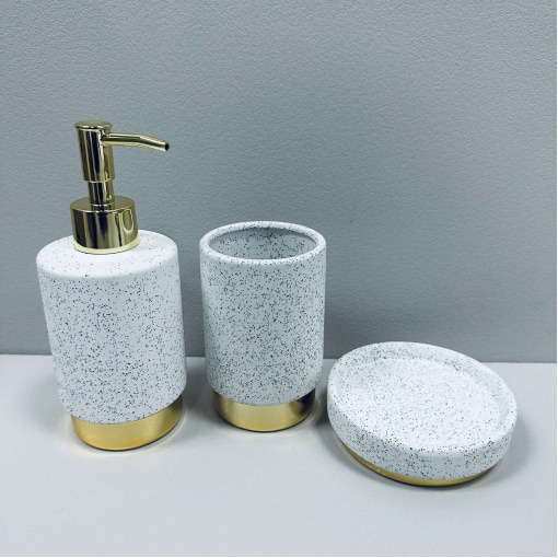 Набор для ванной комнаты (3 предмета) дозатор для мыла, стакан зубных щеток и мыльница Белый гранит с золотом Bona Di 851-335