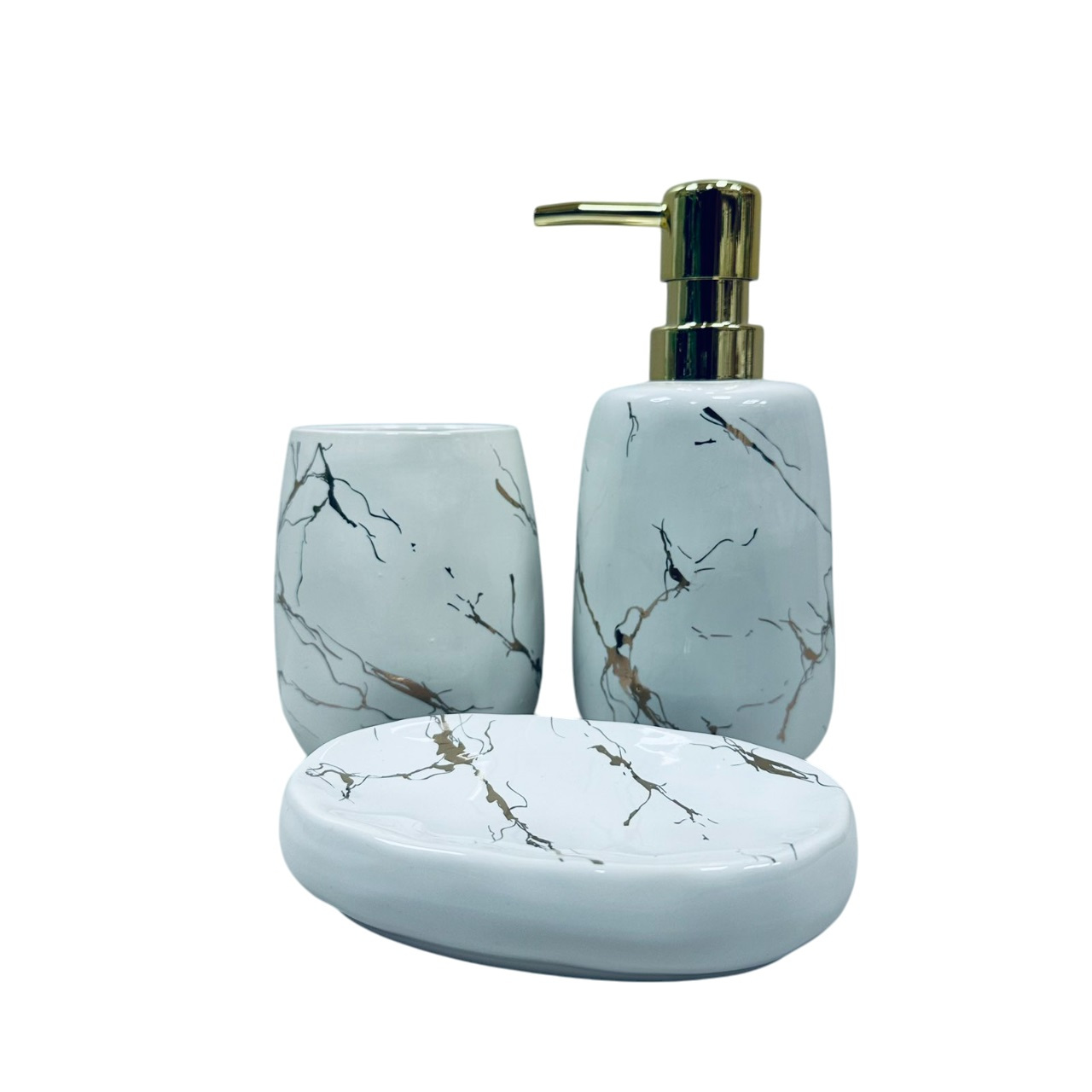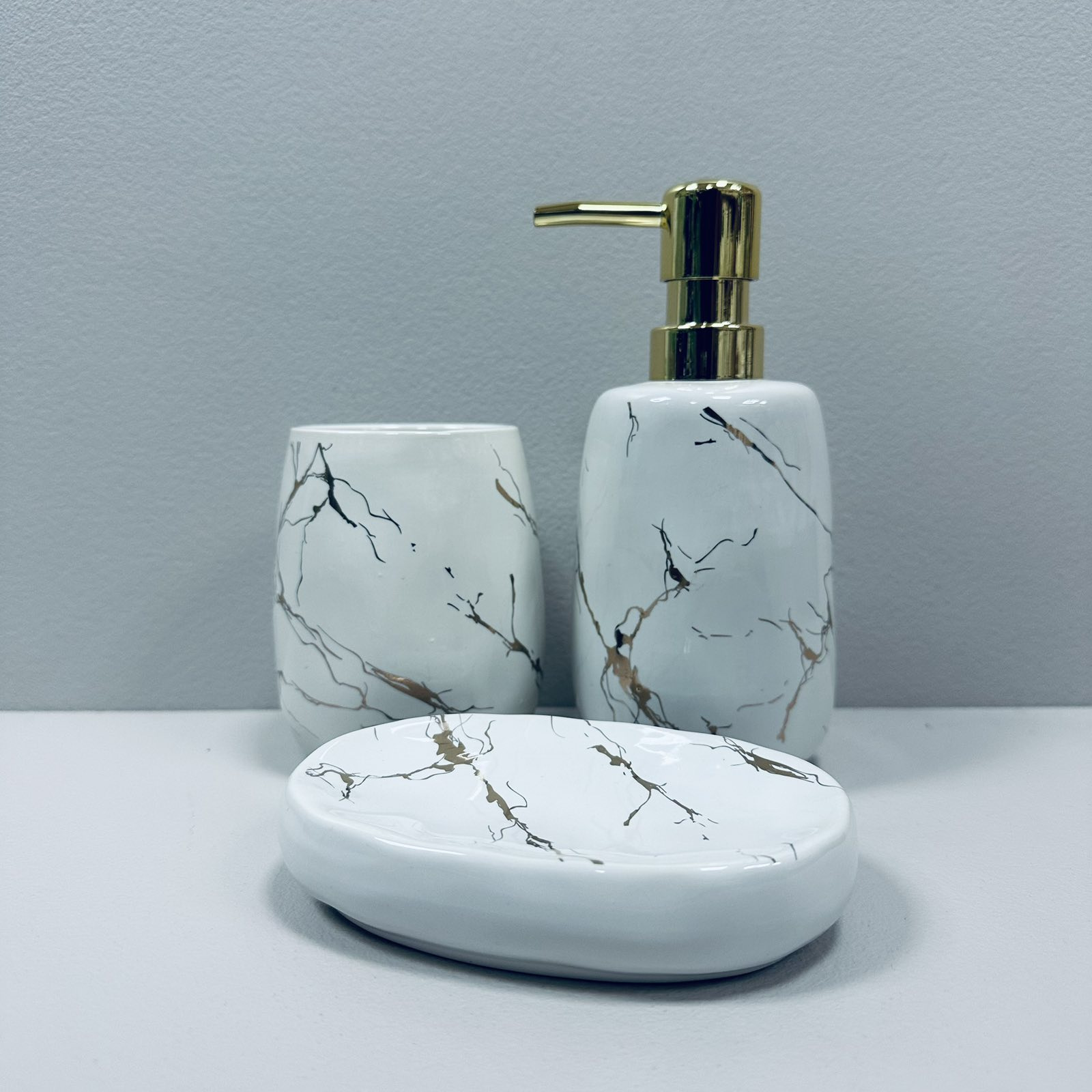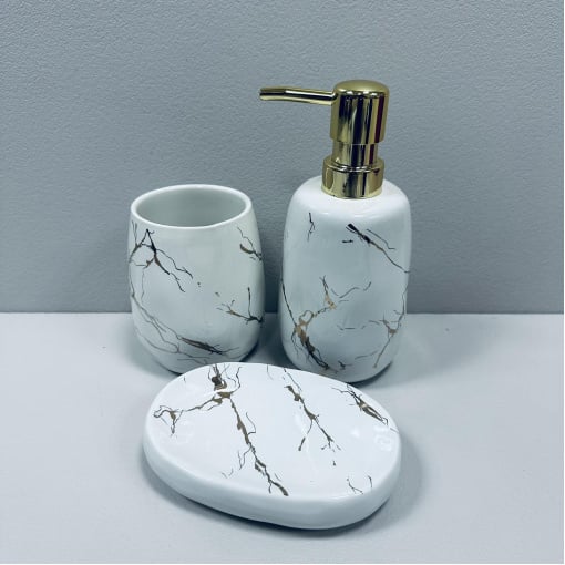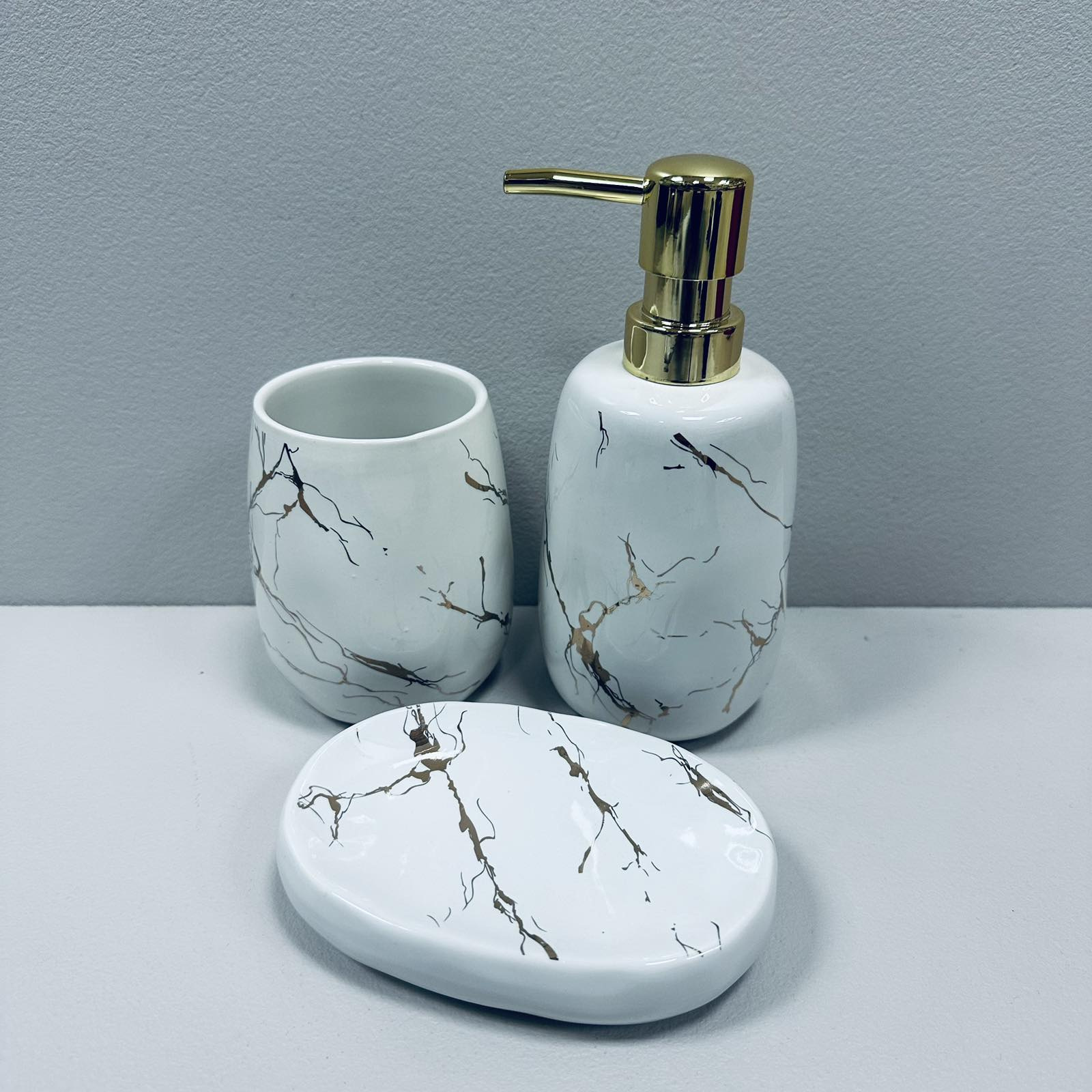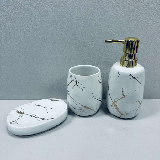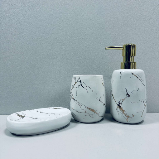 Набор для ванной (3 предмета) дозатор для мыла, стакан для зубных щеток и мыльница Bona Di 853-171 белый мрамор с золотом