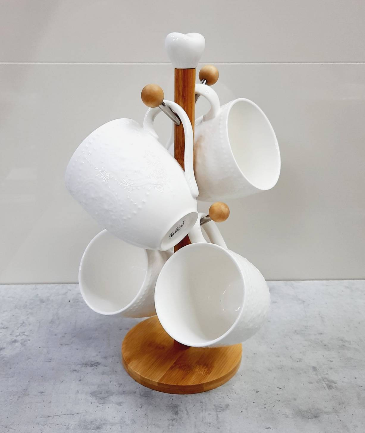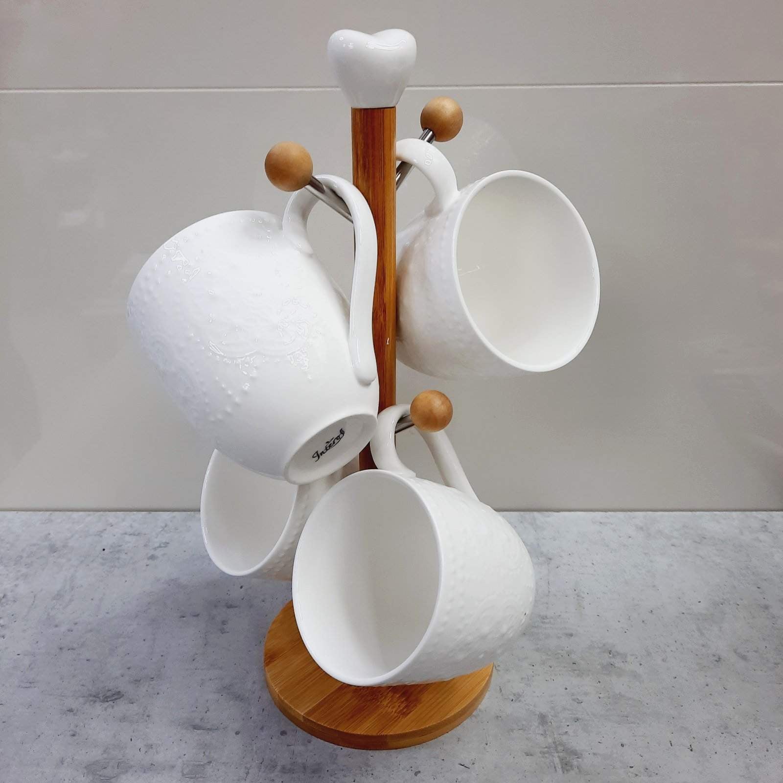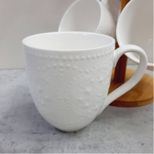 Набор фарфоровых кружок Кружево на деревянной стойке 300 мл Interos PJ 02557