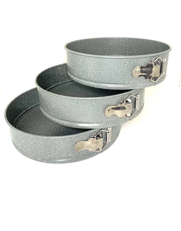 Набор разъемных форм для выпечки A-PLUS 3 шт - это набор из трех разъемных круглых форм для выпечки бисквита c зажимами и антипригарным гранитным покрытием. Такое покрытие облегчает готовку и уход за посудой.