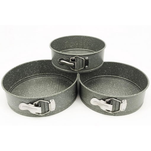 Размеры: 18 см, 20 см, 22 см Тип: Форма Антипригарное покрытие: Мраморное Материал: Углеродистая сталь Разборная конструкция Форма: Круглая Количество в наборе: 3 шт