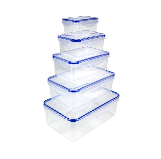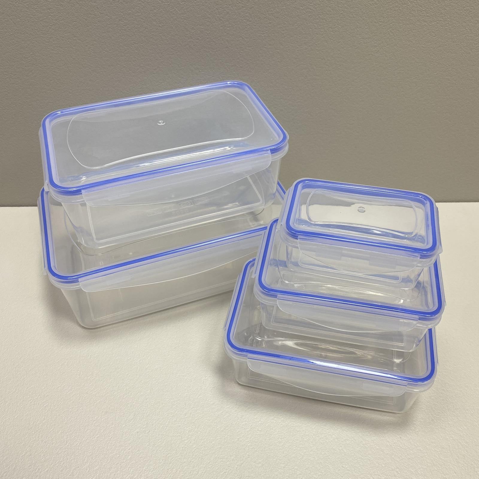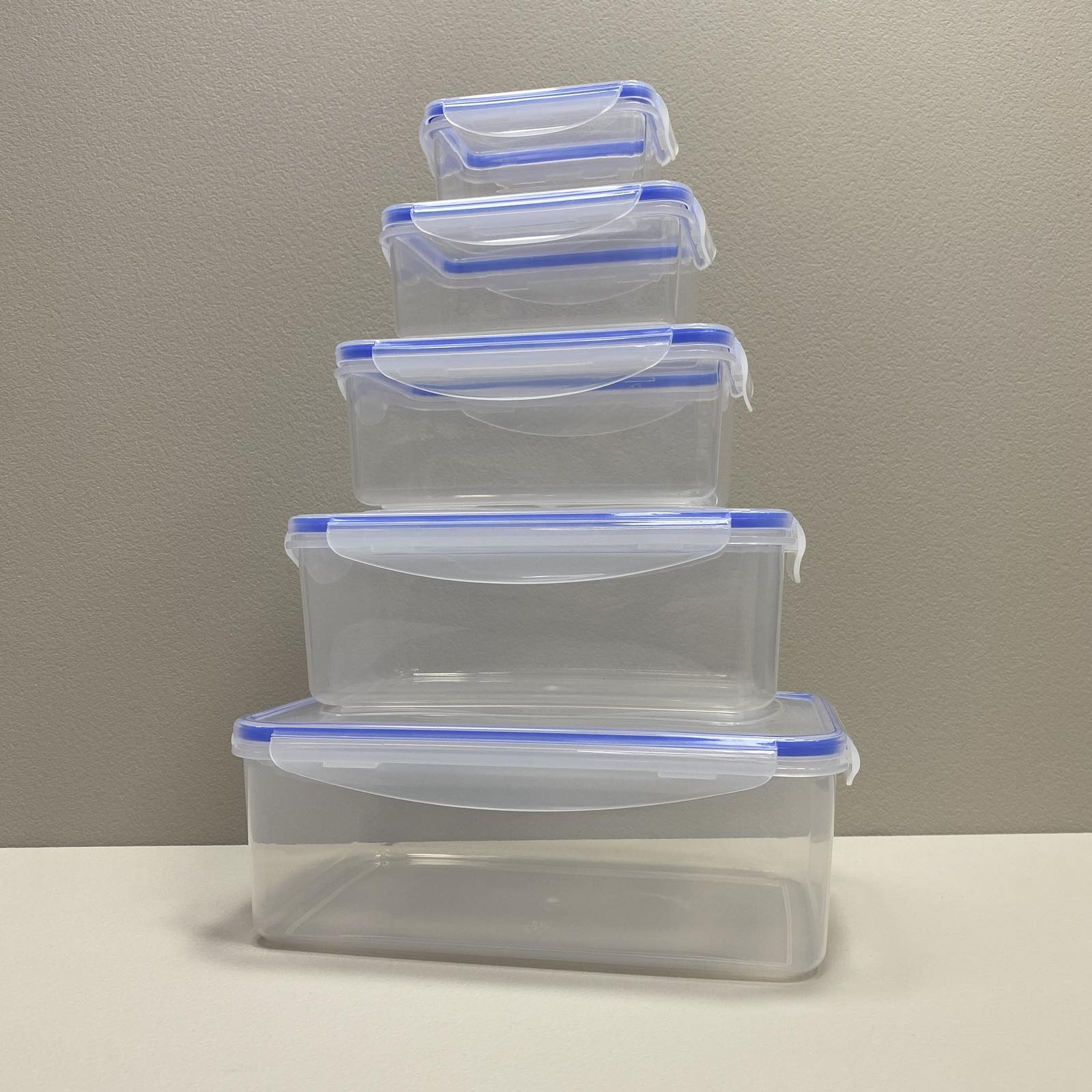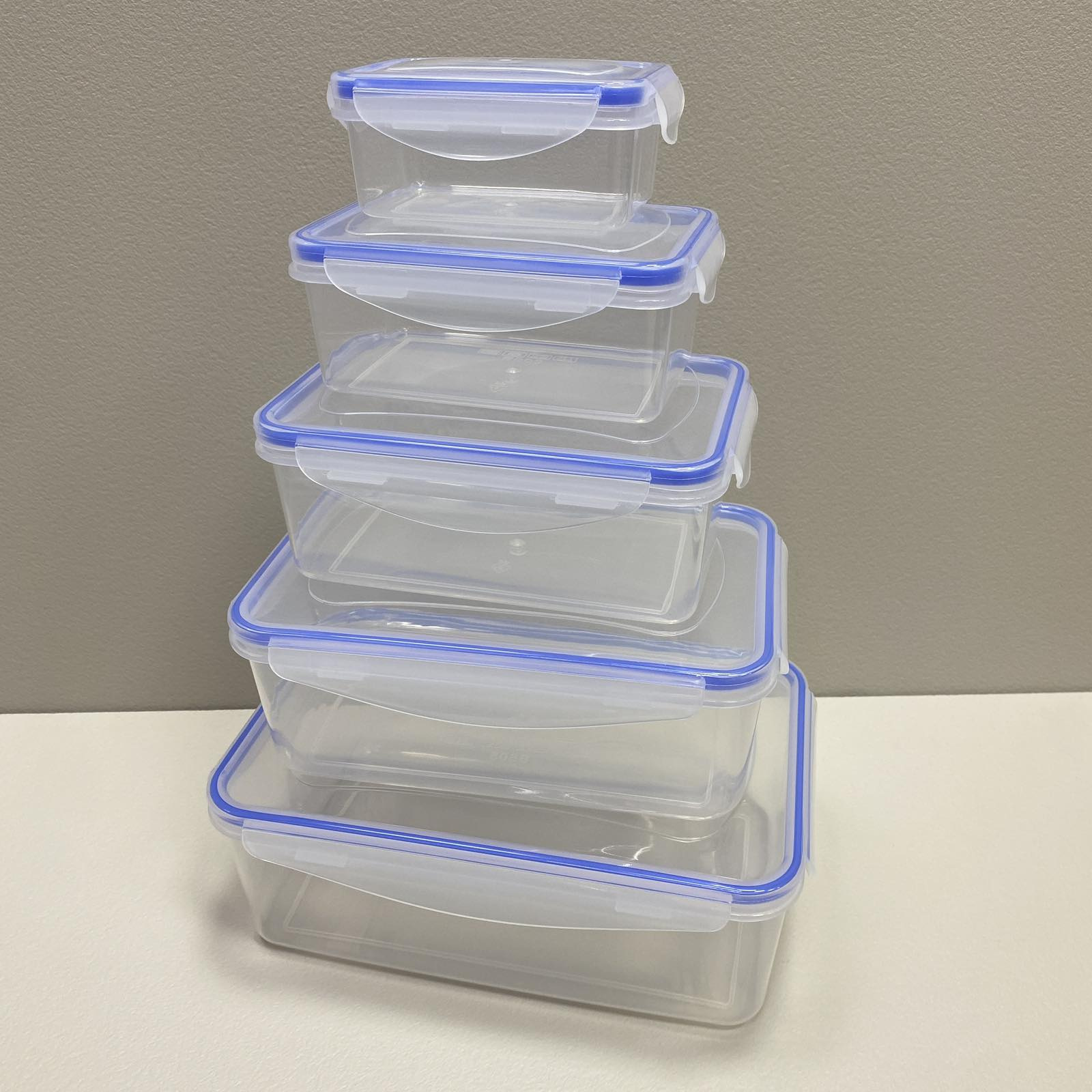 Набор герметичных контейнеров для хранения пластиковых 5 шт Kamille KM-20003 Пищевые контейнеры Kamille функциональной формы предназначены для хранения как отдельных ингредиентов, так и целых блюд. Благодаря силиконовому уплотнителю запах сохраняется в закрытой емкости и вы можете без проблем транспортировать пищу. Набор состоит из 5 контейнеров разного размера, что позволяет их универсально использовать – от хранения небольших закусок до больших порций блюд. Характеристика: Вид: Контейнер Тип поставки: Набор Материал: Пластик Цвет: Прозрачный Количество в наборе: 5 шт Объем: 180 мл, 400 мл, 800 мл, 1200 мл, 2200 мл Размер: 10,5*7*4,5 см, 14*9*5,5 см, 17*11,5*6,5 см,21*13,5*8 см, 24*16*9 см