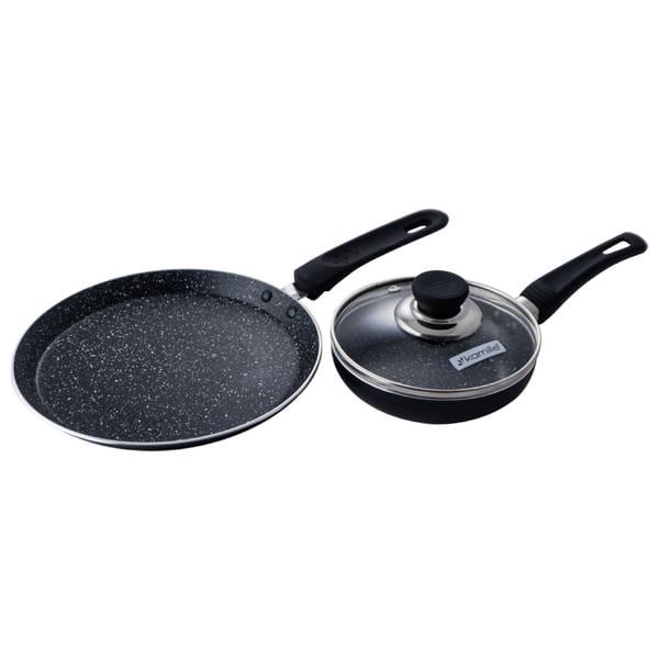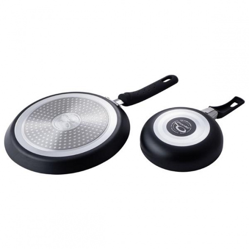В наборе две сковороды: блинная сковорода (Oslash;22х2см) и сковорода универсальная (Oslash;14х3.5см) со стеклянной крышкой. Изготовлены из алюминия с внутренним антипригарным покрытием Marble. Инновационное противопригарное покрытие позволит готовить с минимальным количеством жира и масла, что очень важно для здорового питания. Покрытие экологически чистое, оно не вредит Вашему здоровью и выдерживает температуры до 400 градС. Высокая стойкость к царапинам и истиранию. Бакелитовые ручки почти не нагреваются и не скользят в руке (покрытие soft touch). Индукционное дно позволяет быстро и равномерно нагреваться, дольше держать тепло. Сковороды годятся для любых типов плит, включая стеклокерамику и индукционные плиты.