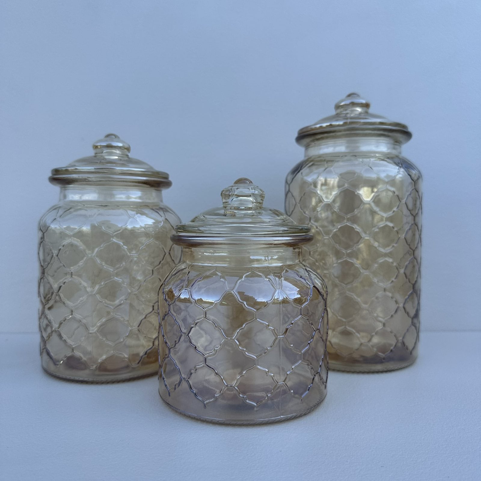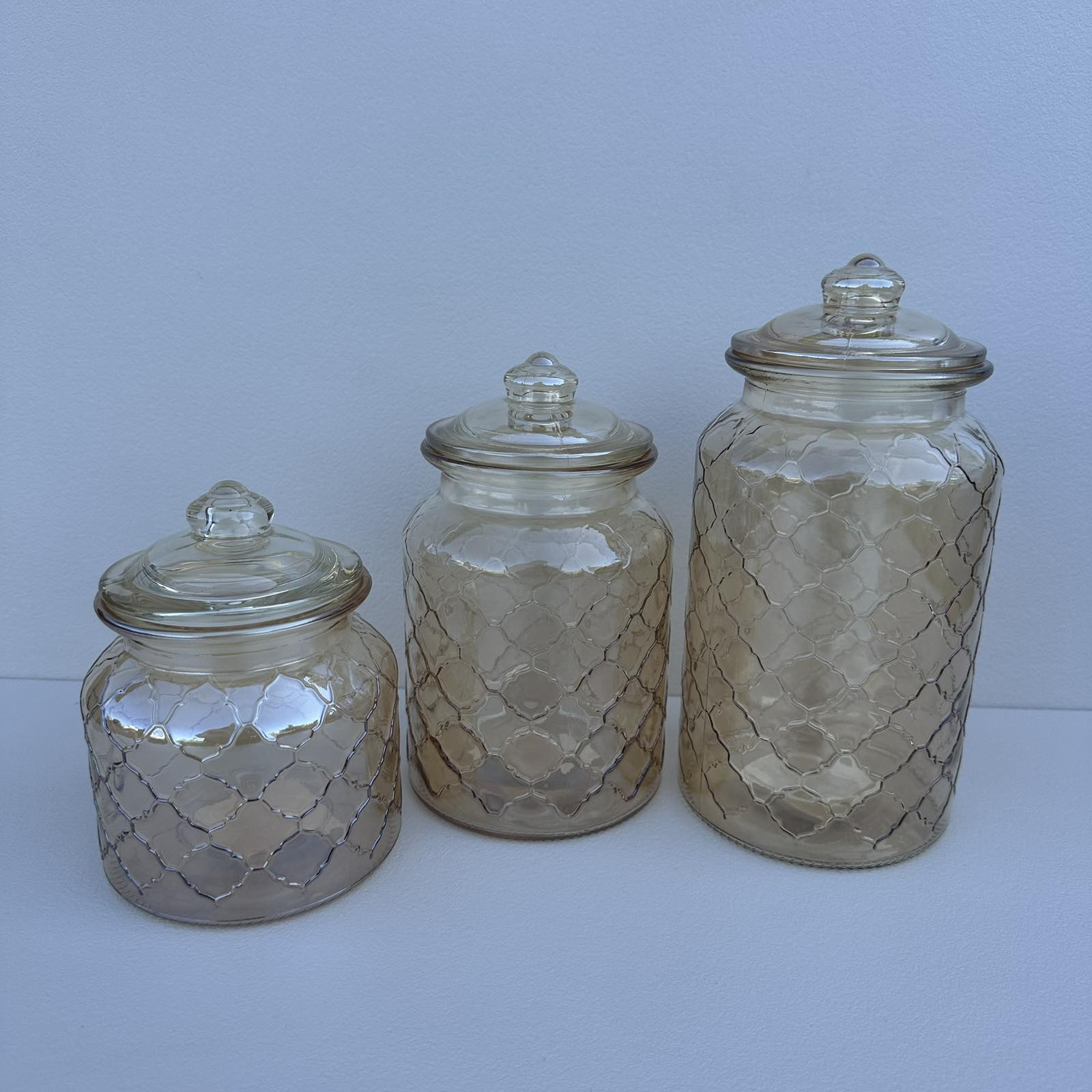 Идеально подходит для хранения кофе, специй, соли, сахара и других сыпучих продуктов. Банки имеют современный стильный дизайн, лаконичную форму и оптимальный объем. Характеристика: Вид: Банка Назначение: Для сыпучих Тип поставки: Набор Количество в ноборе: 3 шт Материал: Стекло Материал крышки: Стекло Объем: 1300 мл, 1000 мл, 700 мл Высота: 21,5 см, 18 см, 14,5 см Диаметр: 9,4 см, дна – 11 см Страна-производитель товара: Китай