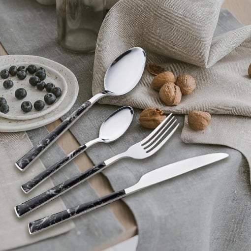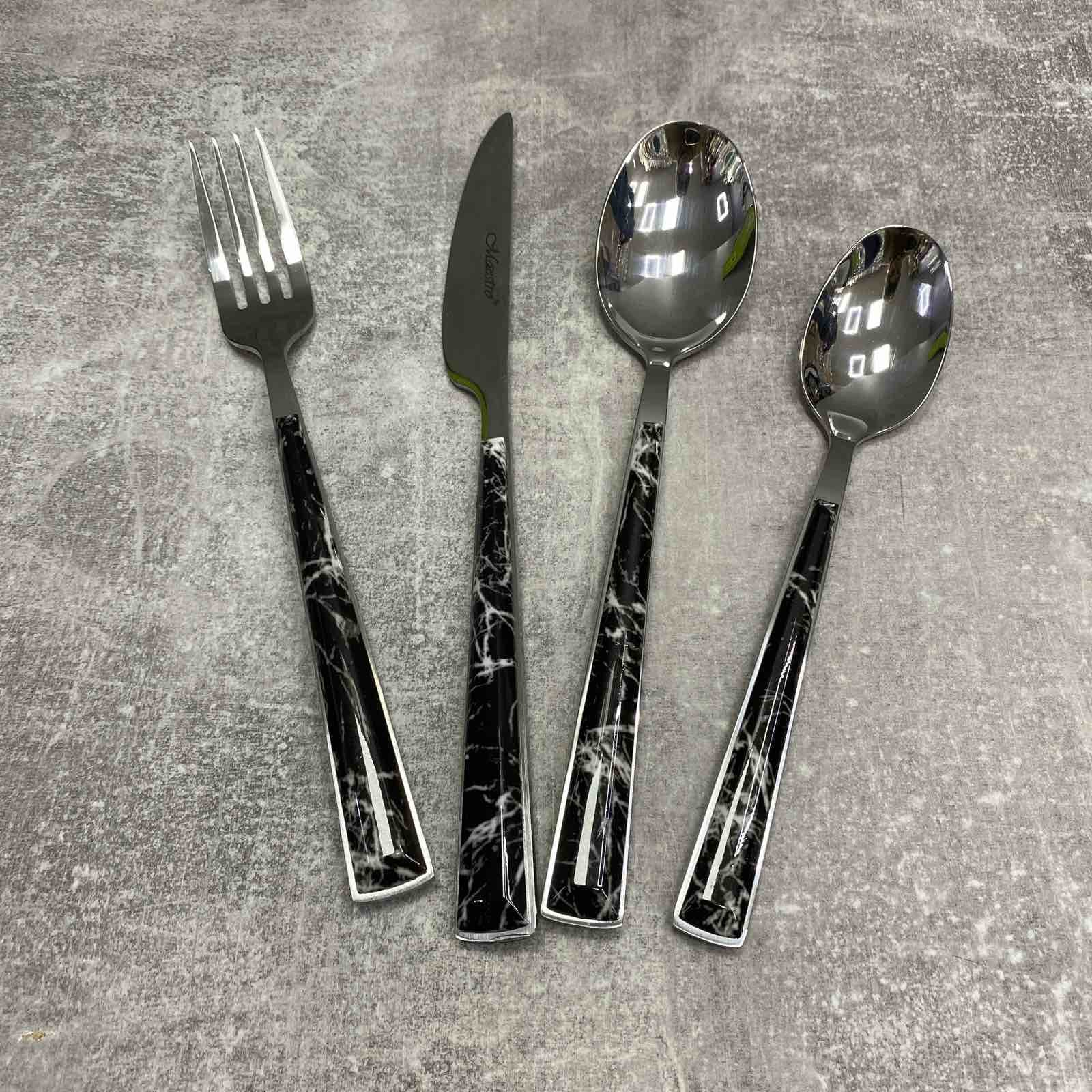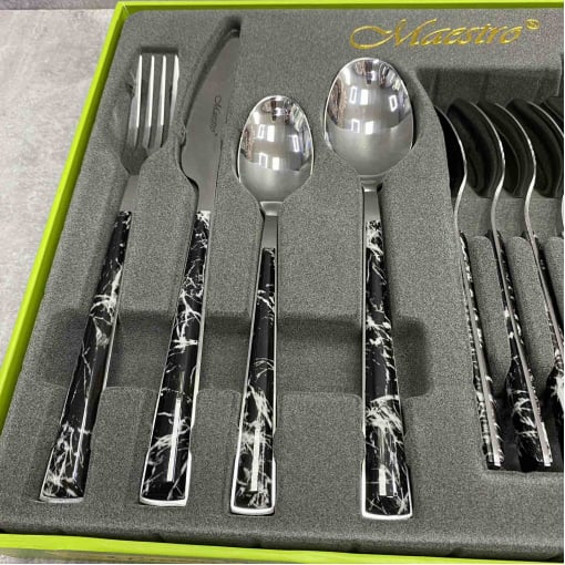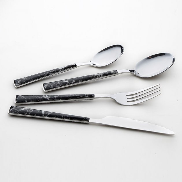 Столовый набор Maestro MR 1535A изготовлен из нержавеющей стали. Отличительной особенностью дизайна столовых приборов является удобная мраморная черная ручка с белыми прожилками.