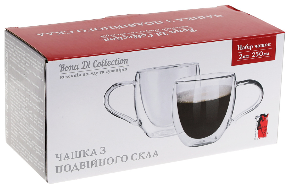 Подробные характеристики Набор термокружек 2 шт стеклянных с двойными стенками 250 мл BonaDi 599-112.