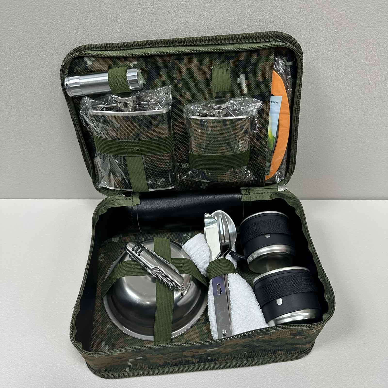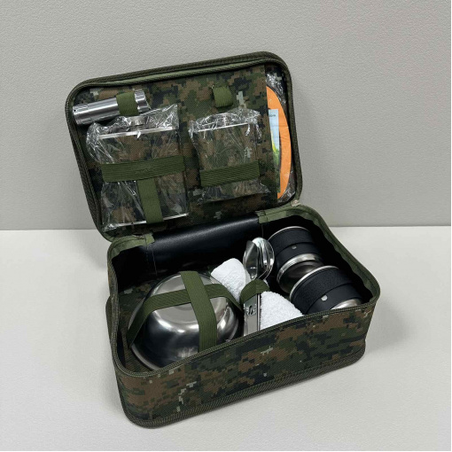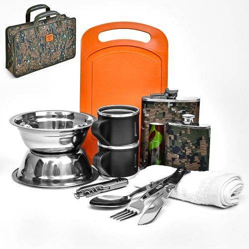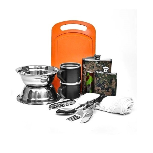 Характеристика: Вид: Набор туристический Назначение: Для охотника/рыбака Материал: Нержавеющая сталь/пластик Комплектация: миска - 2 шт, ложка - 1 шт, вилка - 1 шт, чем - 1 шт, чашка - 2 шт, мультитул - 1 шт, полотенце - 1 шт, фляга - 2 шт, фонарик - 1 шт, доска разделочная - 1 шт