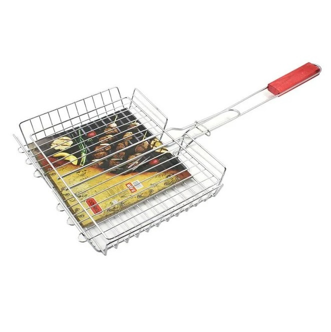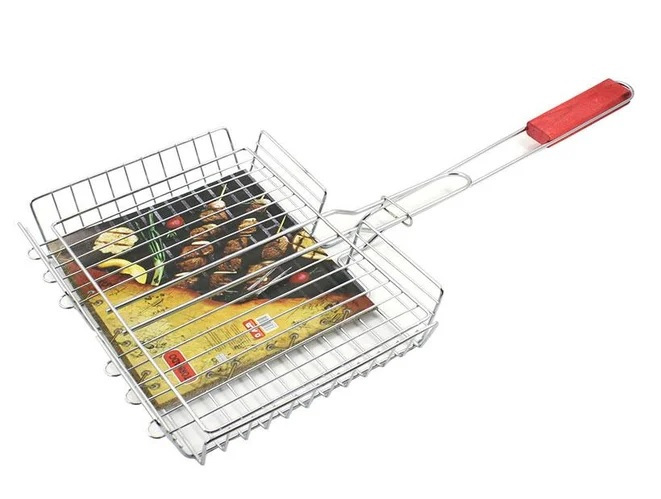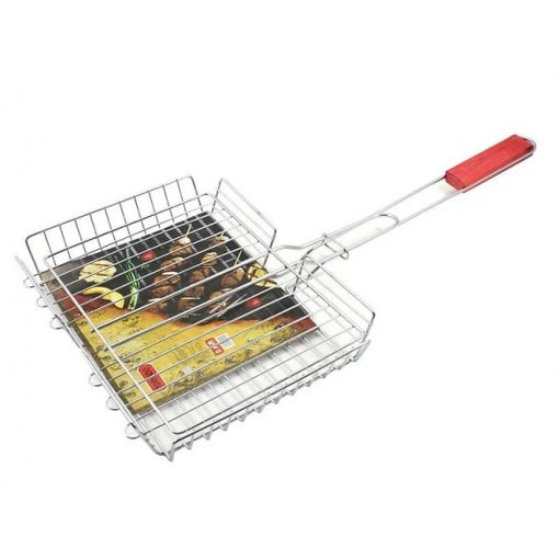 Барбекю решетка гриль лучший выбор для пикника на природе и на даче. С приходом теплой погоды многие отправляются на природу для отдыха, а какой отдых без вкусно приготовленных продуктов на открытом огне. В этом Вам поможет такое замечательное приспособление, как решетка для гриля. Она легкая по весу и удобная в эксплуатации. Решетка барбекю изготовлена из хромированной стали, не поддается коррозии, не выделяет вредных веществ и не меняет вкус и запах еды даже при высокой температуре, ручка деревянная. Форма и удачная конструкция барбекю дает возможность с легкостью закрепить решетку на мангале, а кольцо на ручке фиксирует решетку. Готовить на решетке очень удобно и быстро, а интересная форма переплетения прутьев придаст уж очень аппетитный вид.