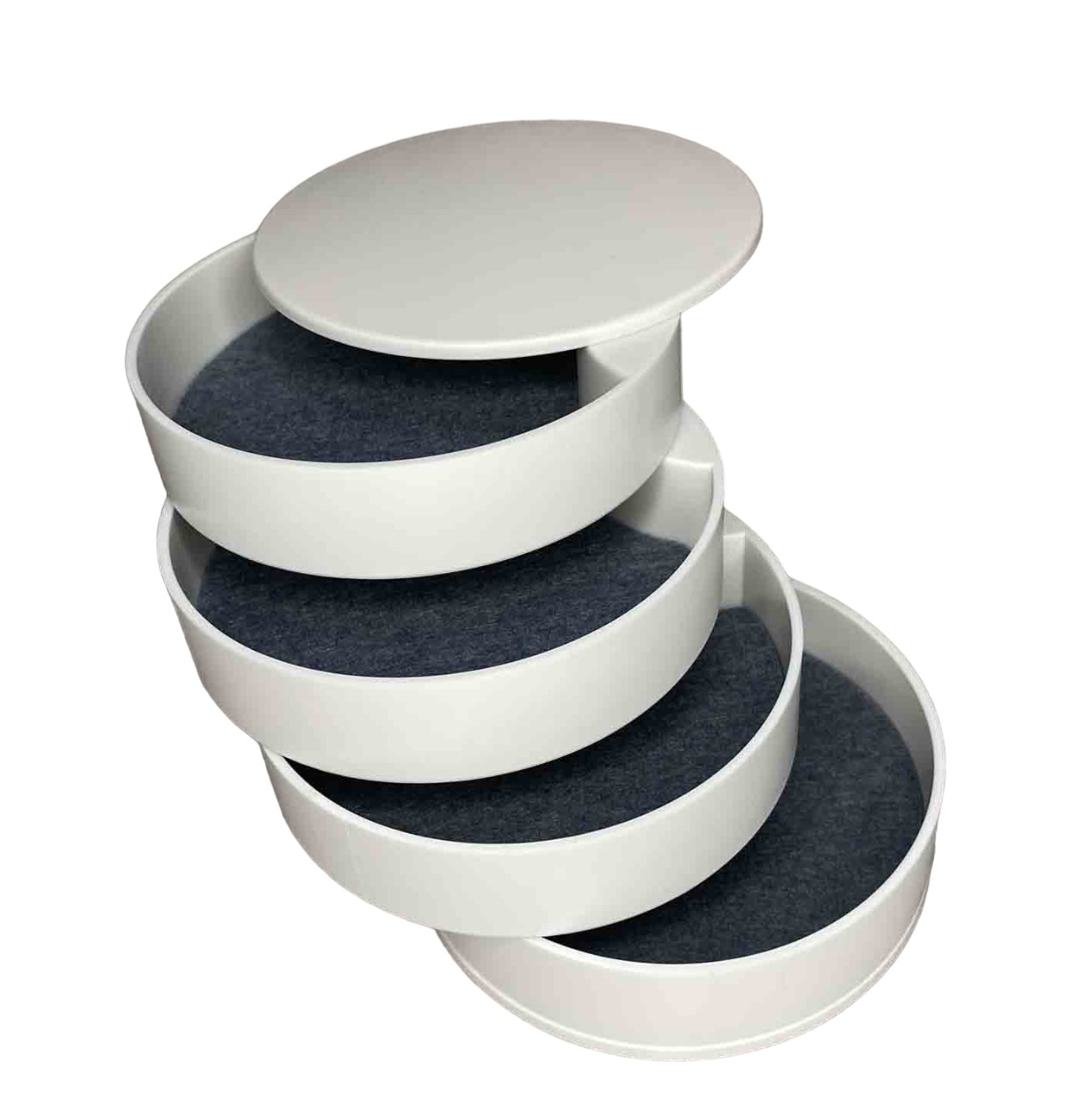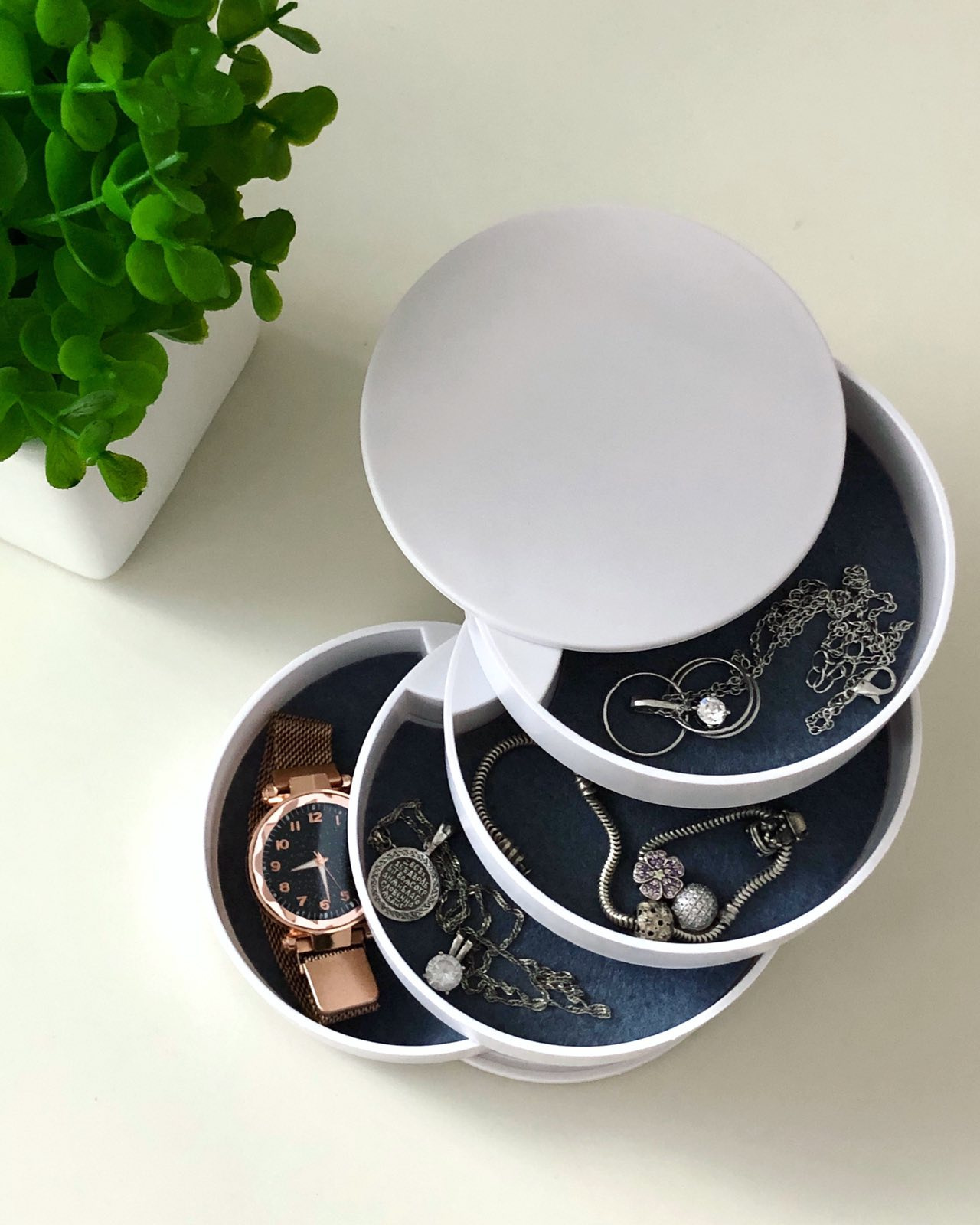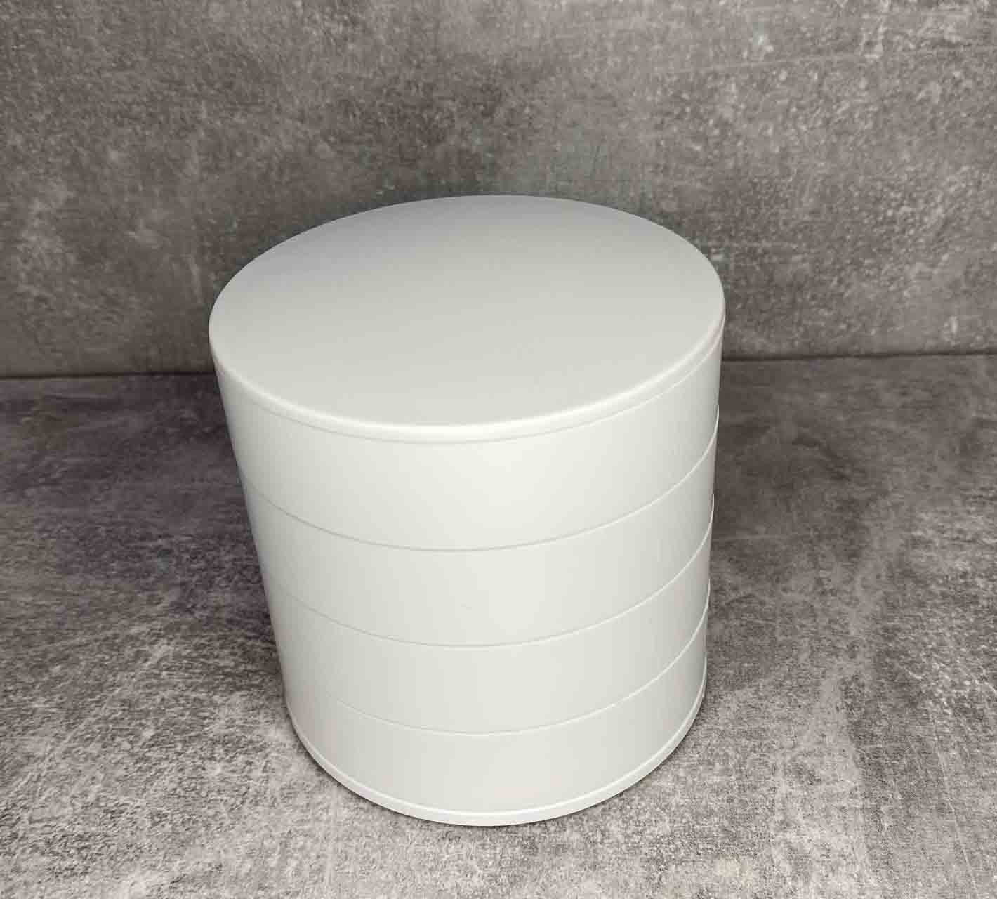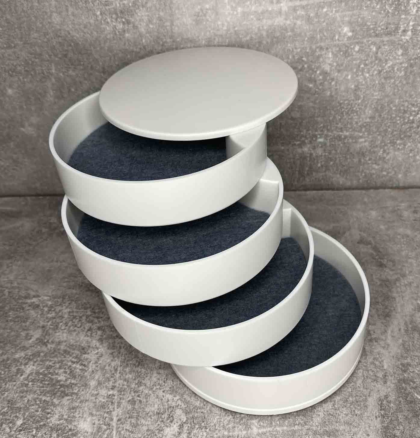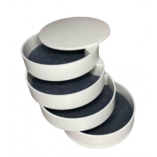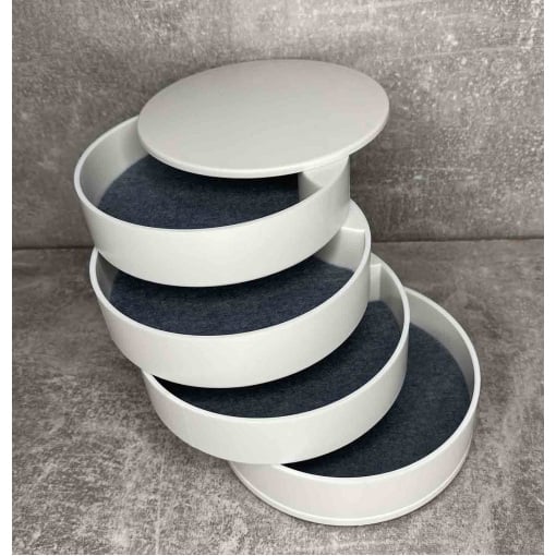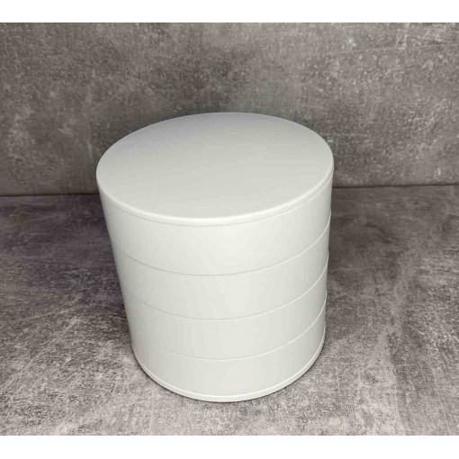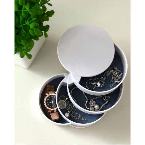 Шкатулка для хранения ювелирных изделий и бижутерии белая 4 отделения A-Plus 546687 В этой чудо шкатулке помещаются все необходимые ювелирные украшения и аксессуары. Все ярусы, в том числе и зеркало, вращаются на 360°. Зеркало вращается в любую сторону, наклон держит. Качество обязательно порадует. В каждом ярусе вложена войлочная прокладка от скольжения украшений. На донышке имеются 4-ре прорезиненные ножки (вкладыши). Характеристика: Вид: Шкатулка Материал: Пластик Размер: 10*10*10 см Форма: Круглая Назначение: Для хранения бижутерии, ювелирных изделий и тд. Особенности: Высокая механическая прочность Небольшой вес Привлекательная поверхность Элегантная, компактная, вместительная шкатулка органайзер - лучший подарок тем, кого Вы любите!