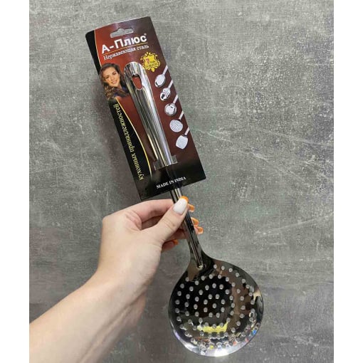 Это удобный и практичный прибор для любой кухни. Можно использовать при приготовление пищи как дома, так и в ресторанах барах кафе. Прибор изготовлен из высококачественной нержавеющей стали, поэтому они не тускнеют, не вступают в химические реакции и не меняют вкус продуктов. Приборы из нержавеющей стали способны служить долгие годы. Шумовка оснащена удобной ручкой из высококачественного пластика.