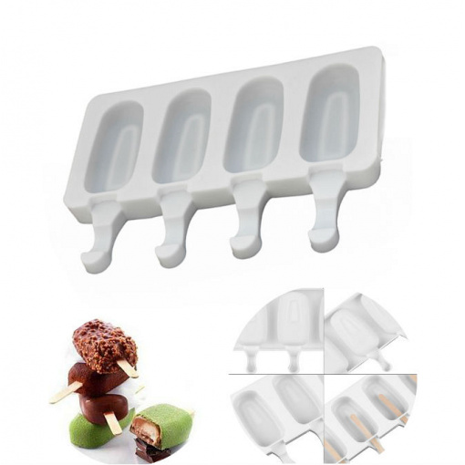 С помощью формы для мороженого одновременно можно приготовить 4 порции вкусного мороженого своими руками, а также популярных муссовых пирожных в виде эскимо. Силиконовая форма значительно упрощает процесс приготовления домашнего мороженого или замороженного сока.