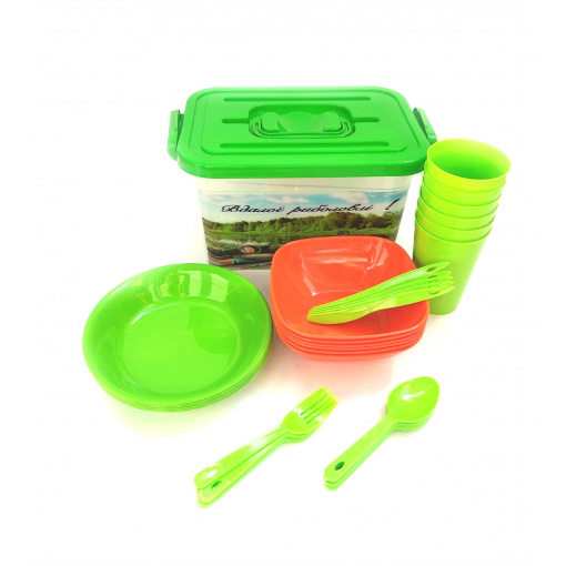 Набор изготовлен из высококачественного пищевого (первичного полипропилена). Вся посуда исполнена в современном стиле, что подчеркнет красоту вашего пикника, а яркие тарелки и стаканы будет легко найти даже на зелёной траве.