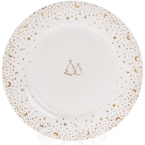Нежная посуда для уютного зимнего стола. Тарелка изготовлена ​​из белого фарфора с золотым декором новогодней тематики. Она станет отличным подарком к Рождественским праздникам или Новому Году. Лучшая идея оригинального положительного и практичного подарка в период зимней сказки.