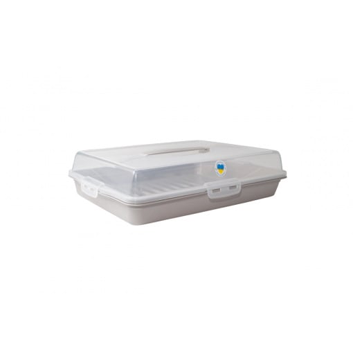 Тортовница с крышкой прямоугольная 44*30*9,5 см какао/прозрачная Алеана 169057 Тортовщица-контейнер с крышкой предназначена для переноски торта, пирожных или других продуктов, длительного хранения в холодильнике, а также хорошей подачи на сервированный стол. Большая емкость и высокая крышка позволят поместить в контейнер от маленького пирога до большого торта. Тортовщица изготовлена ​​из высококачественного пищевого пластика. Характеристики: Вид: Тортовница Размер: 44*30 см Материал: Пластик Высота: 9,5 см Форма: Прямоугольная На щеколдах: 4 шт