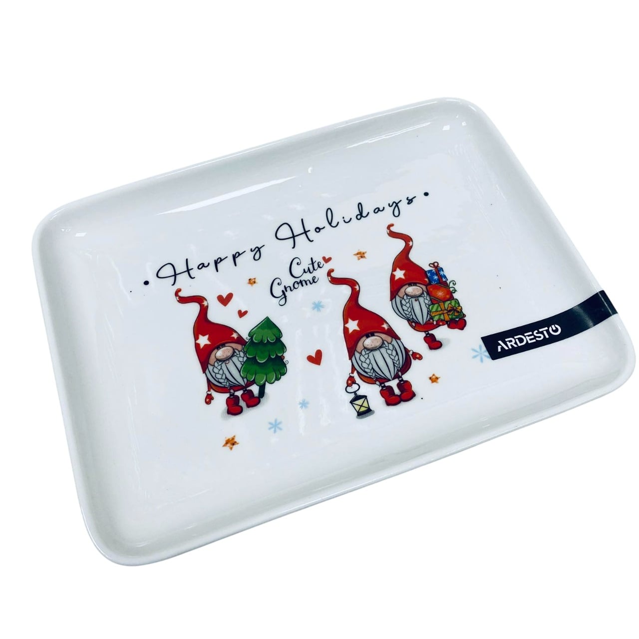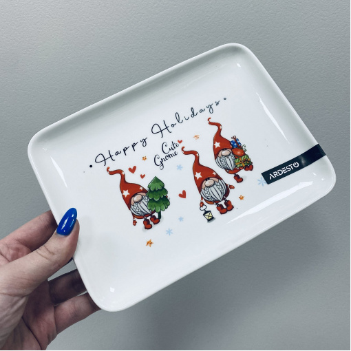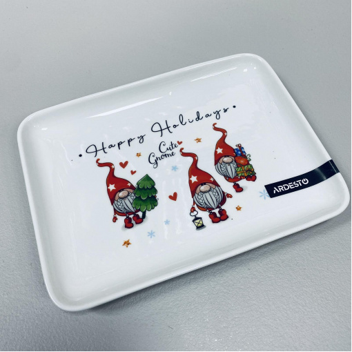 Блюдо порцелянове 19,5*14,6*2,1 см Ardesto Gnomes AR3064 Характеристика: Вид: Блюдо Матеріал: Порцеляна Розмір: 19,5*14,6*2,1 см Форма: Прямокутна Колір: Білий Декор: Новорічний