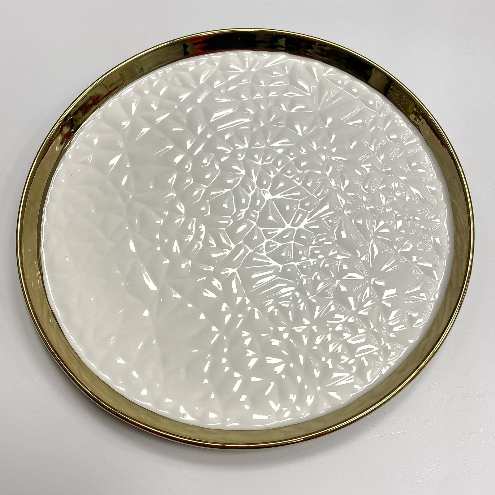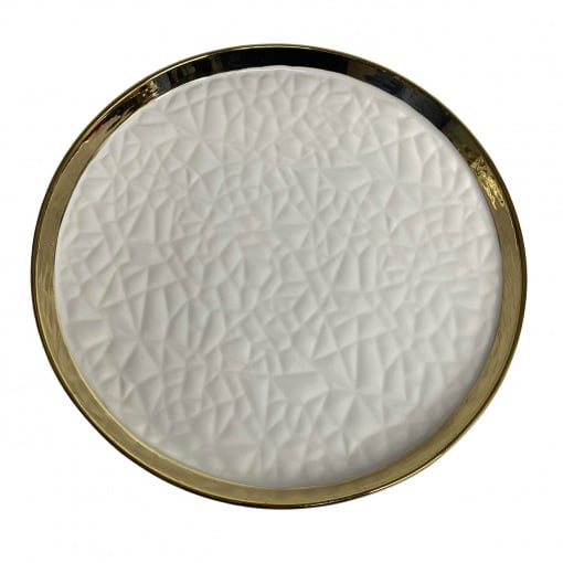 Посуд Bonadi добре підійде до будь-якого столу, а новорічна колекція подарує святковий настрій та милі спогади про ваші свята! Характеристика: Вид: Блюдо Матеріал: Порцеляна Діаметр: 24 см Висота: 2 см Колір: Білий із золотим обідком Форма: Кругла