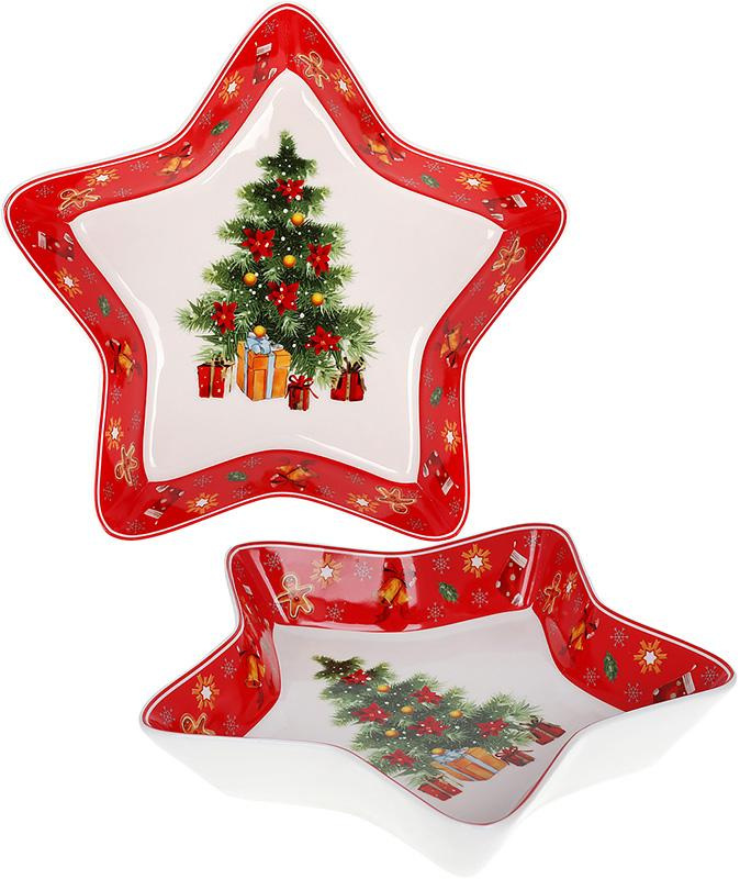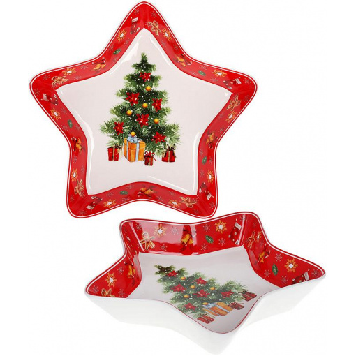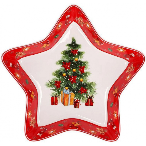 Яскравий посуд для затишного та веселого різдвяного столу. Блюдо виготовлене з порцеляни з малюнком ялинки в центрі, по краях – червона облямівка. Блюдо має форму зірочки. Воно упаковане у кольорову подарункову коробку та стане чудовим подарунком до Різдвяних свят або Нового Року. Найкраща ідея оригінального позитивного та практичного подарунка в період зимової казки.