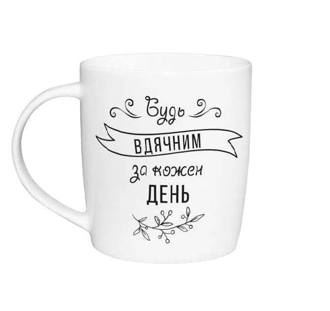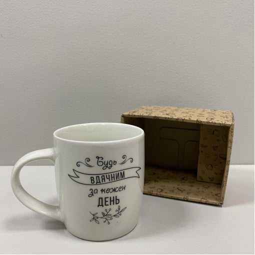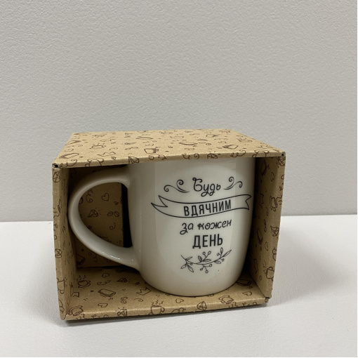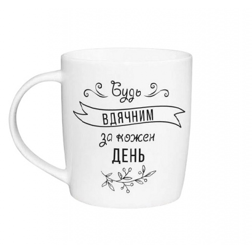 Чашка керамічна 360 мл "Будь вдячним" подарункова коробка Kvarta 1813 бочка Характеристика: Вид: Чашка Матеріал: Кераміка Об'єм: 360 мл Колір: Білий Декор: З надписом Висота: 9 см Діаметр: 8,2 см