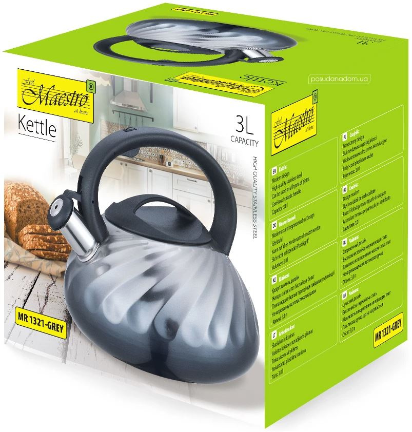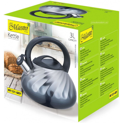 Чайник нержавіючої сталі 3 л Maestro MR-1321 GREY Чайник зі свистком Maestro MR-1321 – це чайник для плити, виготовлений із високоякісної нержавіючої сталі. Сталеві вироби відрізняються міцністю і довговічністю, мають високі гігієнічні та антикорозійні властивості, а також не вимагають особливого догляду і легко миються. Оснащений ручкою, що не нагрівається. Завдяки свистку Ви точно знатимете про момент закипання води. Характеристики: