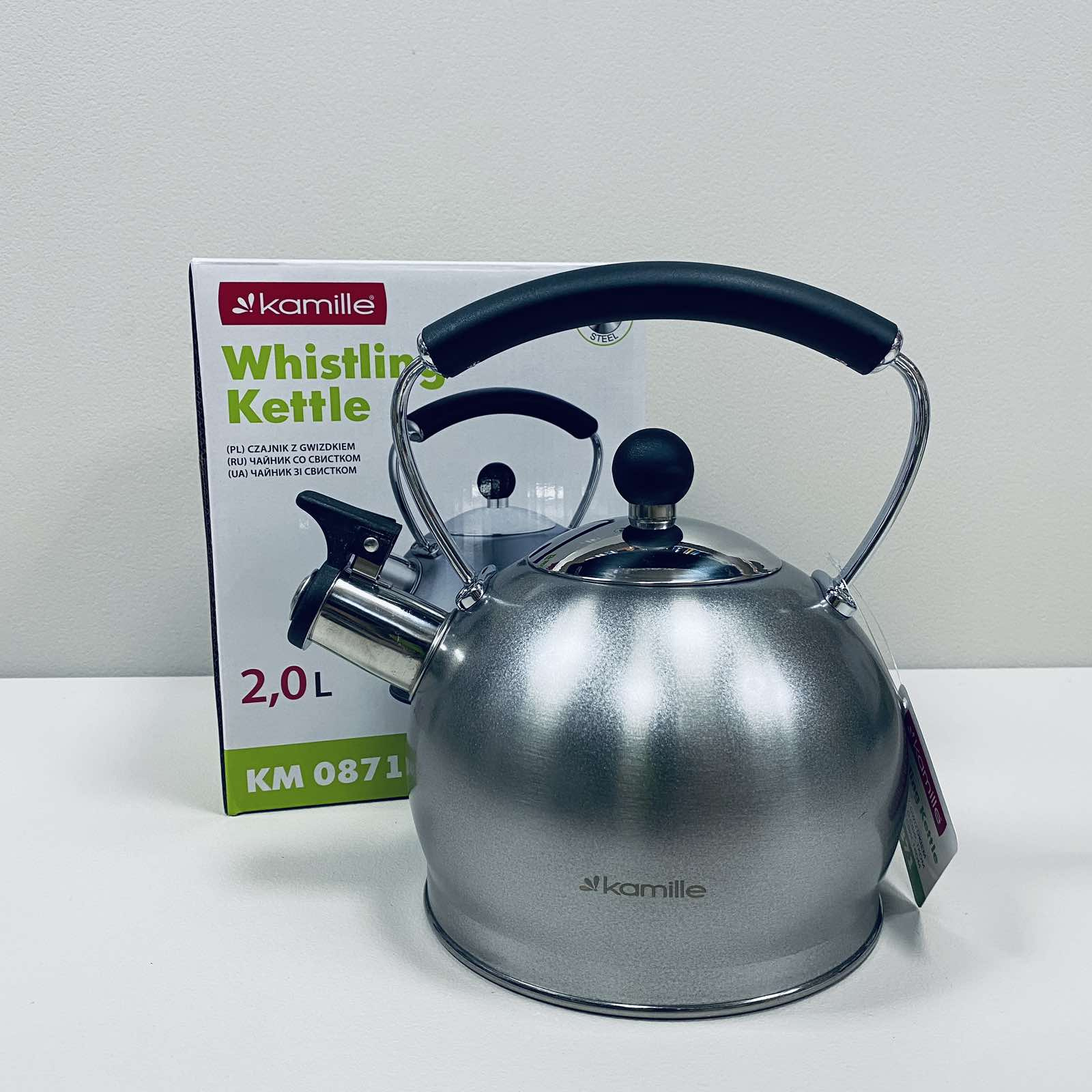 Чайник з нержавіючої сталі зі свистком 2 л Kamille KM-0871 Характеристика: Вид: Чайник Матеріал: Нержавіюча сталь Об'єм: 2 л Матеріал ручки: Нержавіюча сталь/пластик Колір: Сріблястий Зі свистком