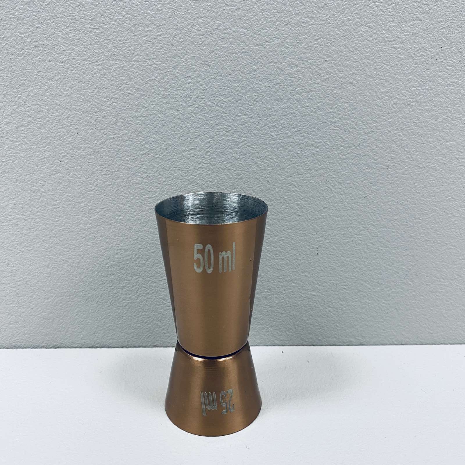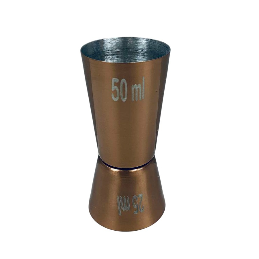 Джиггер з нержавіючої сталі 25/50 мл Empire EM-7908 Джиггер - спеціальний мірний стаканчик для рідин, використовується барменами для контролю кількості інгредієнтів, що додаються в коктейль. Характеристика: Вид: Джиггер Матерыал: Нержавіюча сталь Об'єм: 25/50 мл Висота: 8 см Колір: Бронзовий