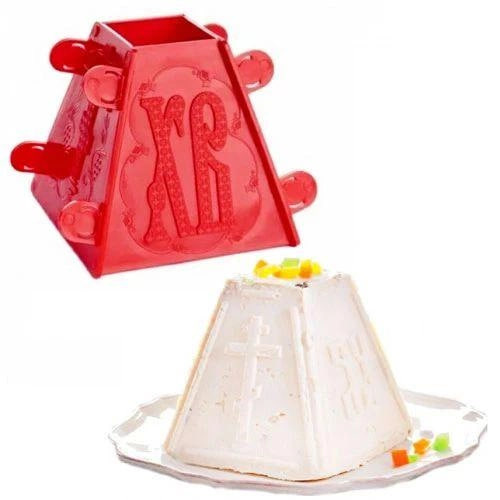 Форма для сирної паски складається з 4 пластикових частин з красивим рельєфним тисненням на тему великодні, які легко з'єднуються між собою спеціальними засувками, формуючи пластикову піраміду. До форми додається докладний рецепт приготування сирної паски. Не можна використовувати в духовці.