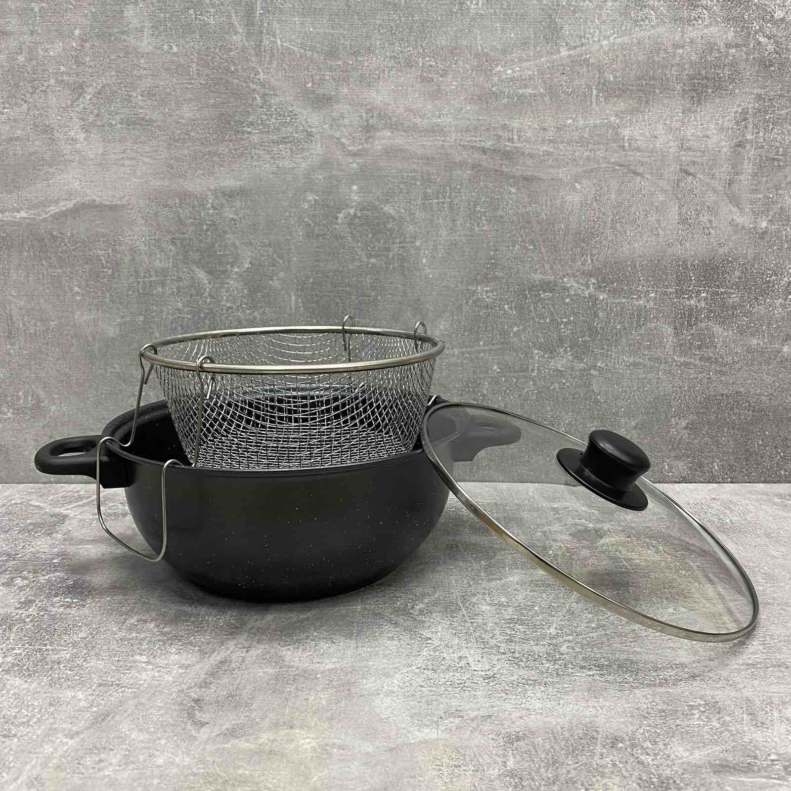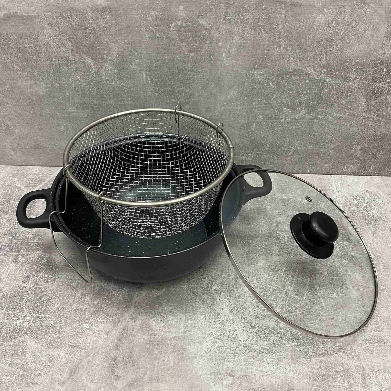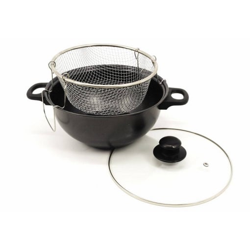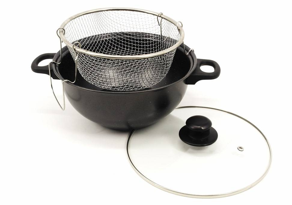 Усі люблять їжу, приготовлену у фритюрі. Картопля-фрі, сирні палички, риба, креветки, пончики, рулетики з начинками, кільця цибулі – все це можна приготувати вдома, маючи фритюрницю. Пропонована модель виготовлена з вуглецевої сталі, має антипригарне покриття. Підходить для електричної та газової плити. Кошик із міцного та легкого металу. Кришка виготовлена із жароміцного скла, має отвір для виходу пари.