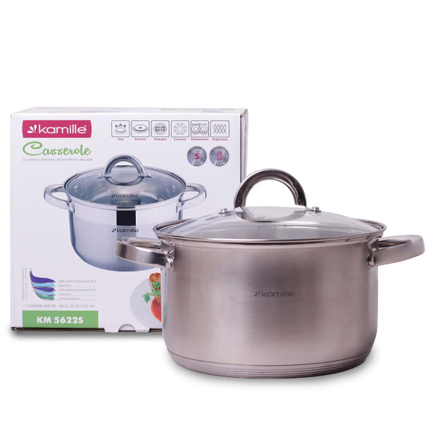 Детальні характеристики Каструля із нержавіючої сталі 5,1л зі скляною кришкою Kamille Classic KM-5622S.