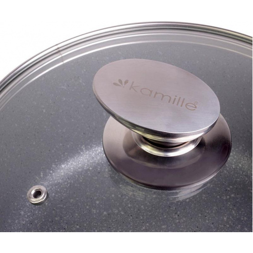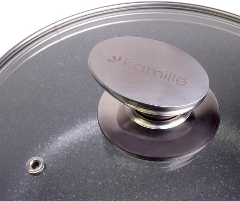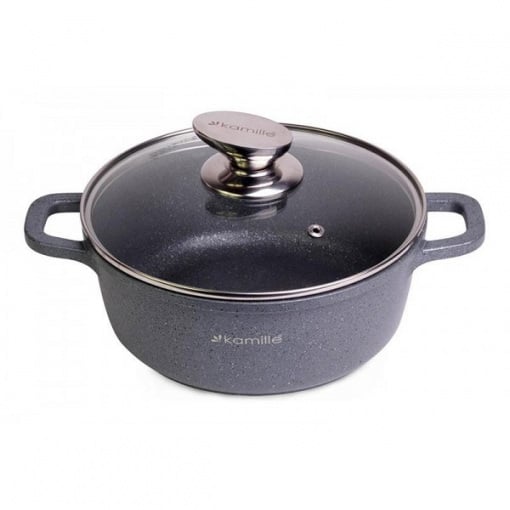 Каструля з кришкою Kamille Landes Grey 4.5 л з алюмінієвими литими ручками Ø24 см 4425 Об'єм 4.5 л. Потовщені алюмінієві стінки тверді та міцні, не піддаються деформації. Чорне мармурове антипригарне покриття підвищує теплорозподільні та антипригарні властивості металу. Стилізований під граніт. Посуд підходить для різноманітних кулінарних завдань; як для варіння рідких страв, так і для підсмаження та гасіння м'яса або овочів. Можна використовувати в духовці. Литі алюмінієві ручки зручно розташовані; Вдало обраний розмір ручок, зручний для обхвату руками та перенесення посуду. Кришка виконана з жароміцного скла із захисним сталевим обідком та паровідведенням. На кришці стильна ручка із нержавіючої сталі. Багатошарове дно дозволяє використовувати каструлю на всіх типах плит, навіть індукційних та склокерамічних. Верхній діаметр каструлі 24 см, висота стінок 11.5 см. Можливе миття в посудомийній машині. Кожна деталь продумана та виконана на високому рівні якості, доводячи каструлю Kamille Landes Grey до досконалості.