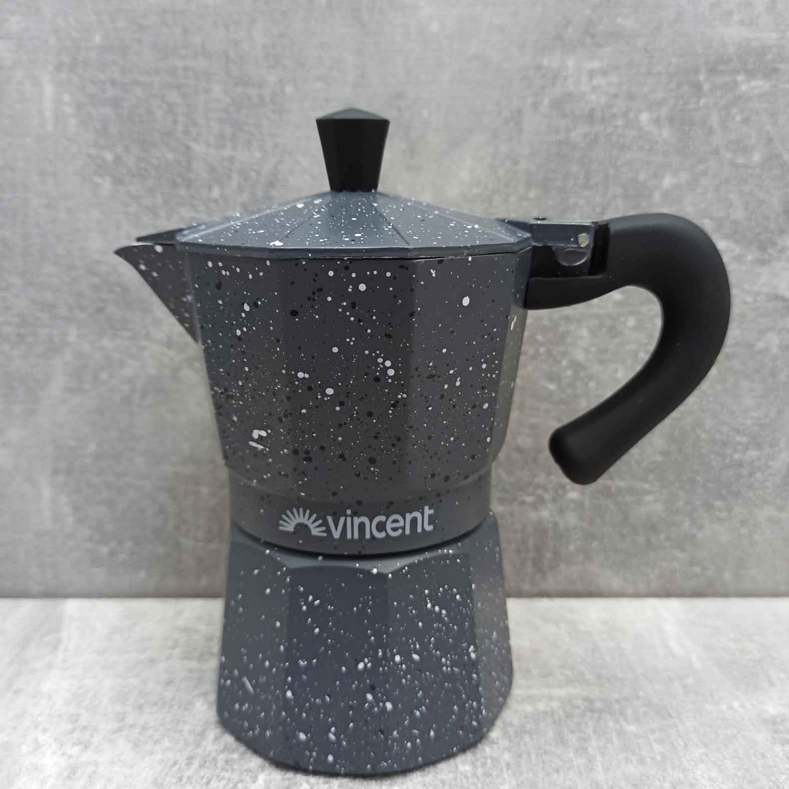 Кавоварка Vincent ідеально підходить для приготування традиційної еспресо кави. Корпус виготовлений із алюмінію. Має зручну ручку із термостійкого пластику, яка не нагрівається. Масивна кришка і правильна форма носика дозволяють легко наливати каву в чашку без розбризкування або розливу.