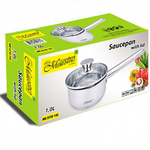 Детальні характеристики Ківш Maestro з нержавіючої сталі з кришкою 1 літра MR-3510-14S.