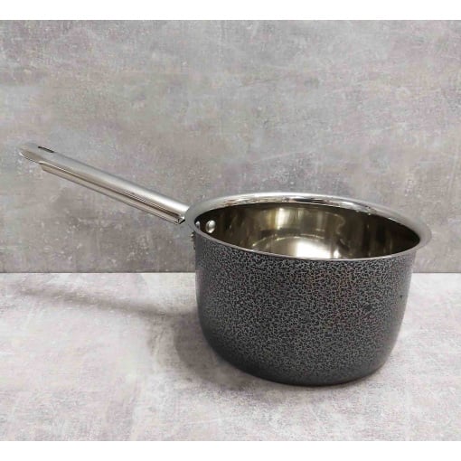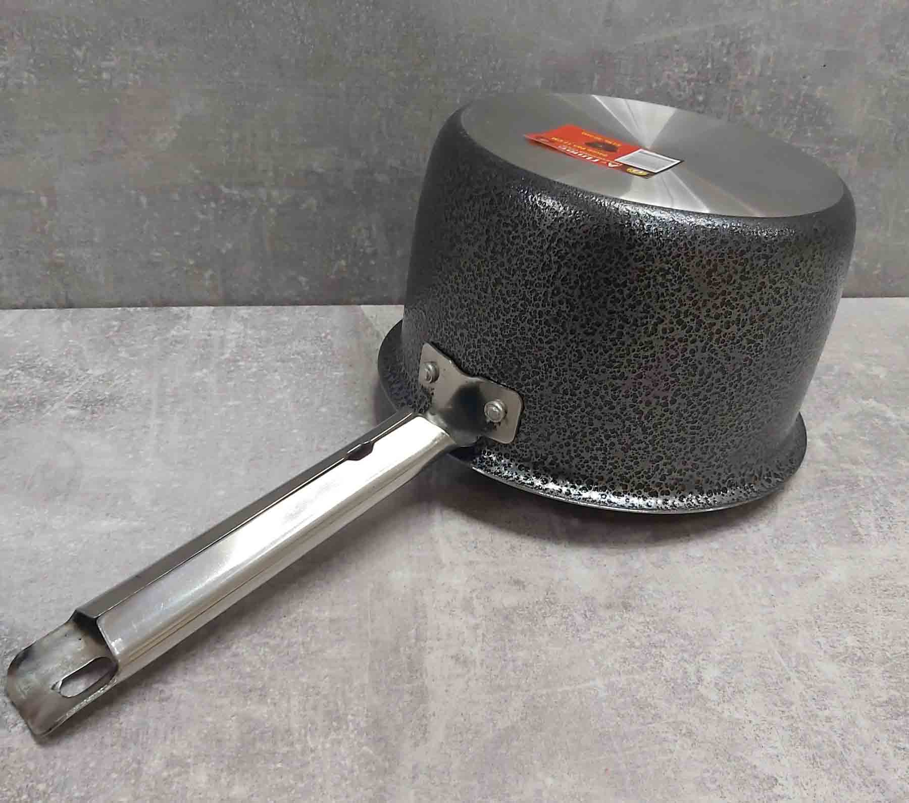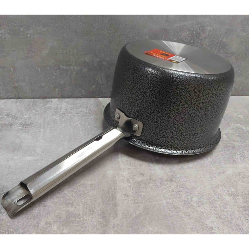 Ківш виготовлений із нержавіючої сталі високої якості. Цей метал не вступає в реакцію з їжею під час приготування, а значить не змінює її смаку та запаху. Легко очищається навіть у холодній воді. Має сучасний дизайн. Одношарове дно. Такий господарський ковш має зручну широку ручку.