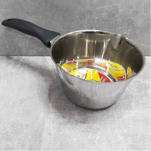 Ківш виготовлений із нержавіючої сталі високої якості. Цей метал не вступає в реакцію з їжею під час приготування, а значить не змінює її смаку та запаху. Легко очищається навіть у холодній воді. Має сучасний дизайн. Одношарове дно У такого господарського ковша зручна широка ручка.