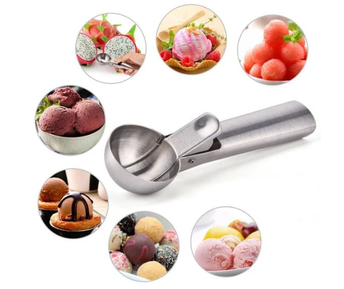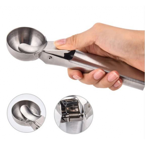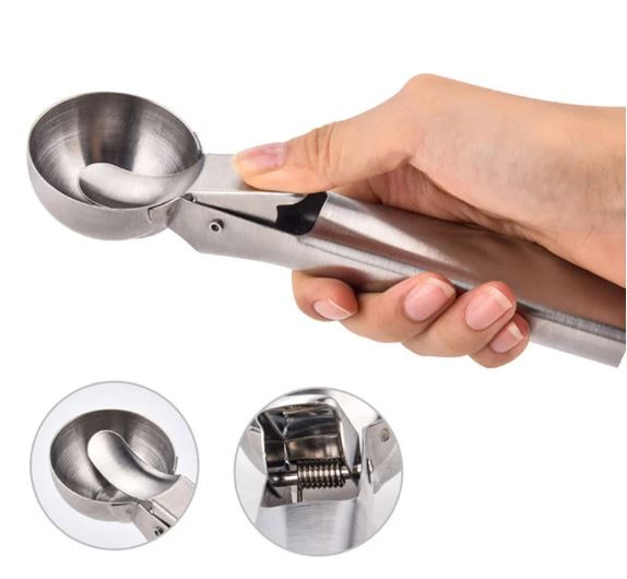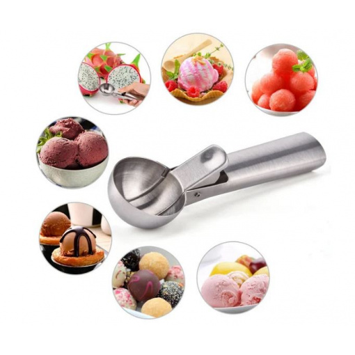 Ложка для морозива Kamille із виштовхувачем. За допомогою такої механічної ложки можна створювати не лише десерти з морозива, а й робити ідеально рівні кульки. Приготувати їх можна з м'якоті фруктів, будь-якого крему, не дуже густого тіста, овочевого або м'ясного пюре. Стіл, прикрашений такою красою, вразить практично кожну людину. Вбудований механізм легко дозволяється виштовхнути кульки продукту з «черпалки».