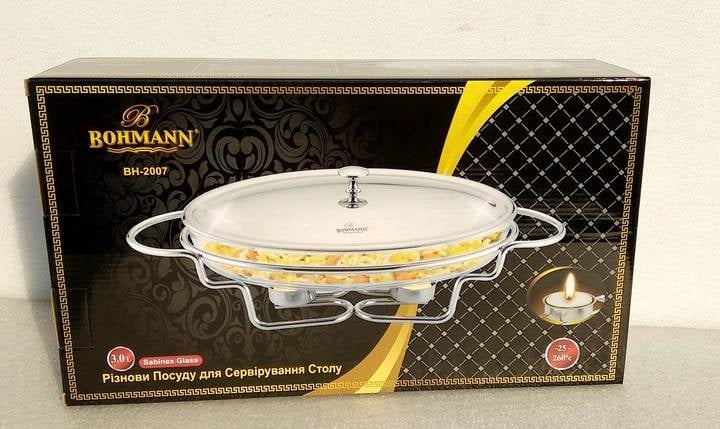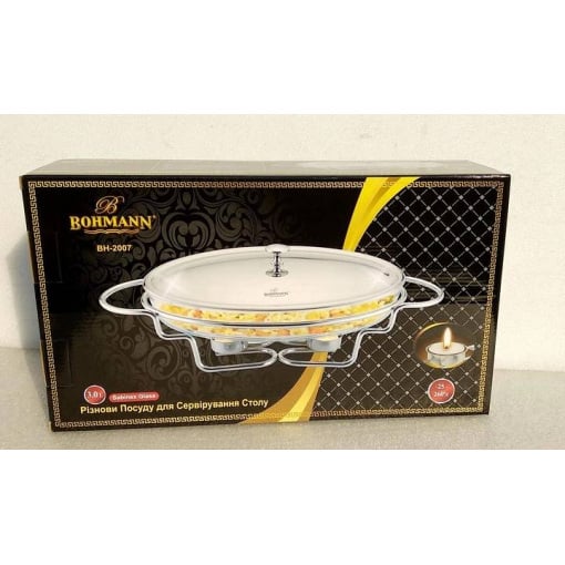 Марміт скляний овальний 3 л Bohmann BH-2007 Марміти призначені для підігріву та підтримки температури вже приготовлених страв. Мармити бувають різної форми – круглі, овальні, прямокутні чи квадратні. Мармити з підігрівом від свічки затребувані на святковому столі, вони не тільки функціональні, а й оригінально виглядають, створюють атмосферу свята. Настільний марміт підтримує температуру тривалий час і немає ризику, що страва пристане на дно і підгорить. Характеристика: