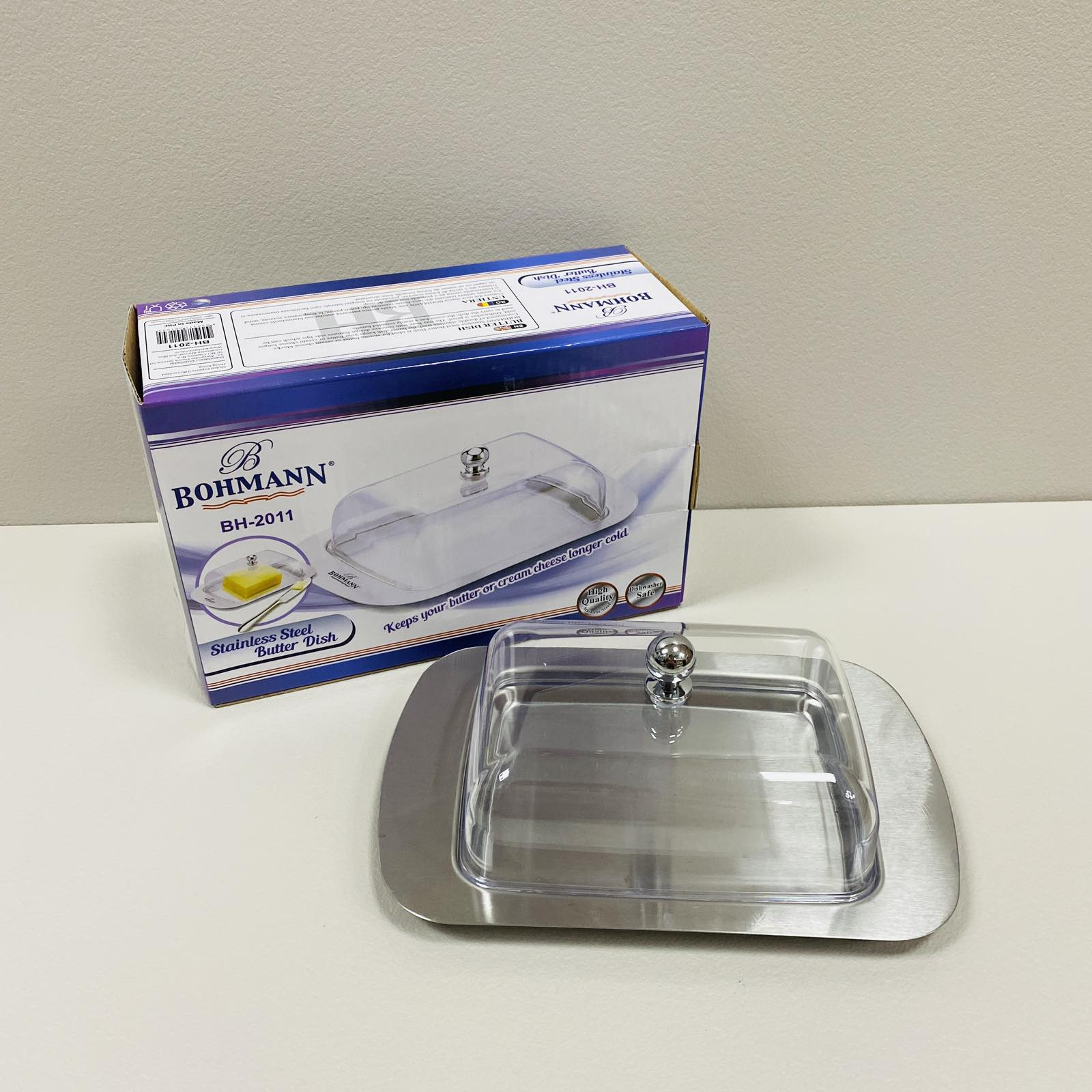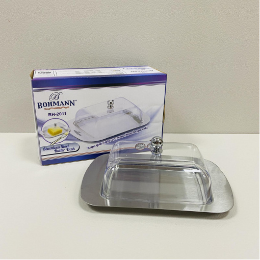 Маслянка з нержавіючої сталі з пластиковою кришкою Bohmann BH-2011 Маслянка Bohmann BH-2011 виготовлена ​​з особливої ​​нержавіючої сталі та пластику, що забезпечує швидке охолодження продукту та тривале збереження прохолоди. Передбачена можливість миття у посудомийній машині. Зручна форма дозволяє легко переміщати олію по будинку. Характеристика: Вид: Маслянка Матеріал: Нержавіюча сталь Матеріал кришки: Пластик Колір: Прозорий зі сталевим Розмір: 19,2*12,5 см Висота: 7 см